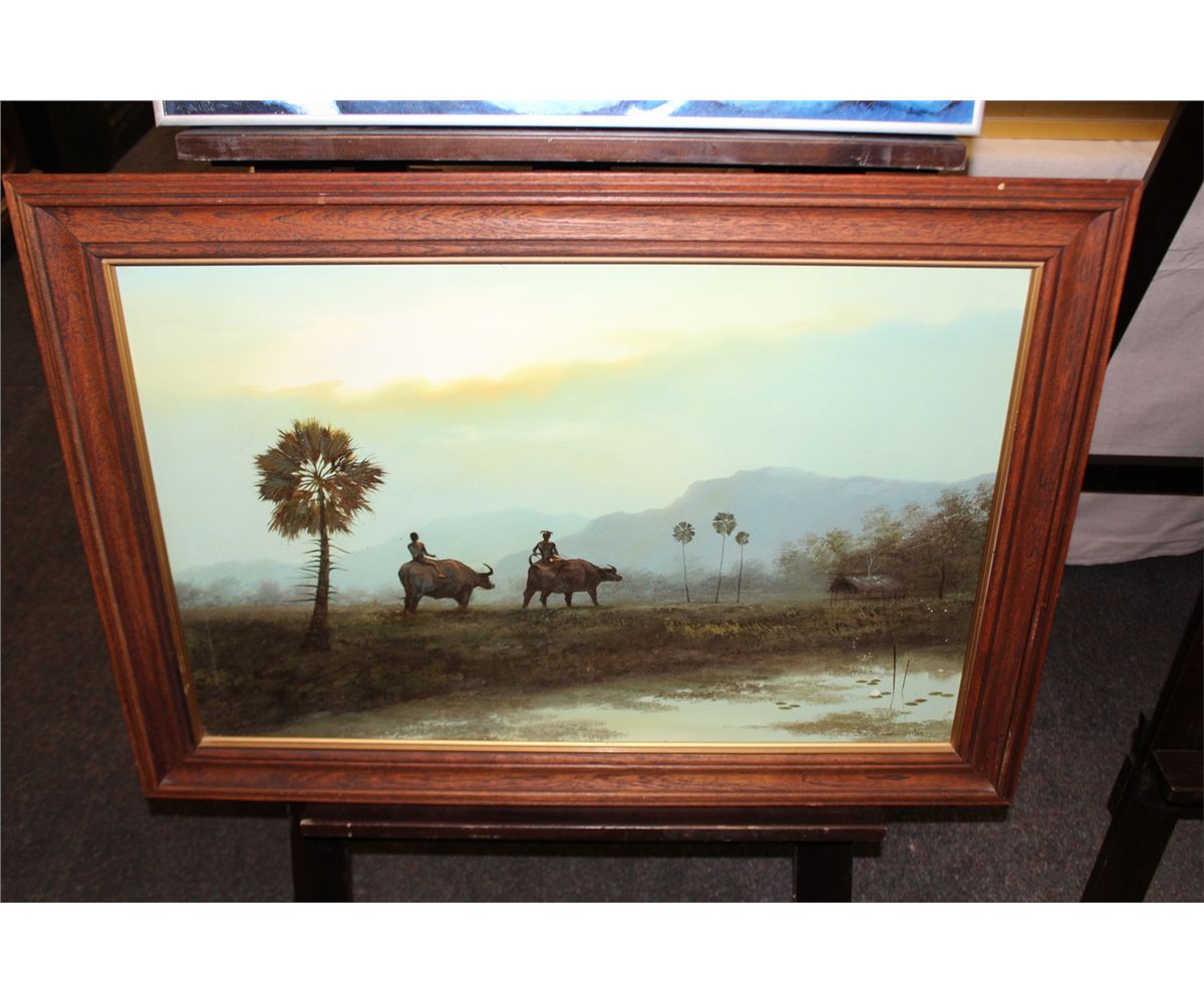 "THAILAND WATER BUFFALO" OIL ON CANVAS, 29" W X 19" H SIGNED LOWER RIGHT