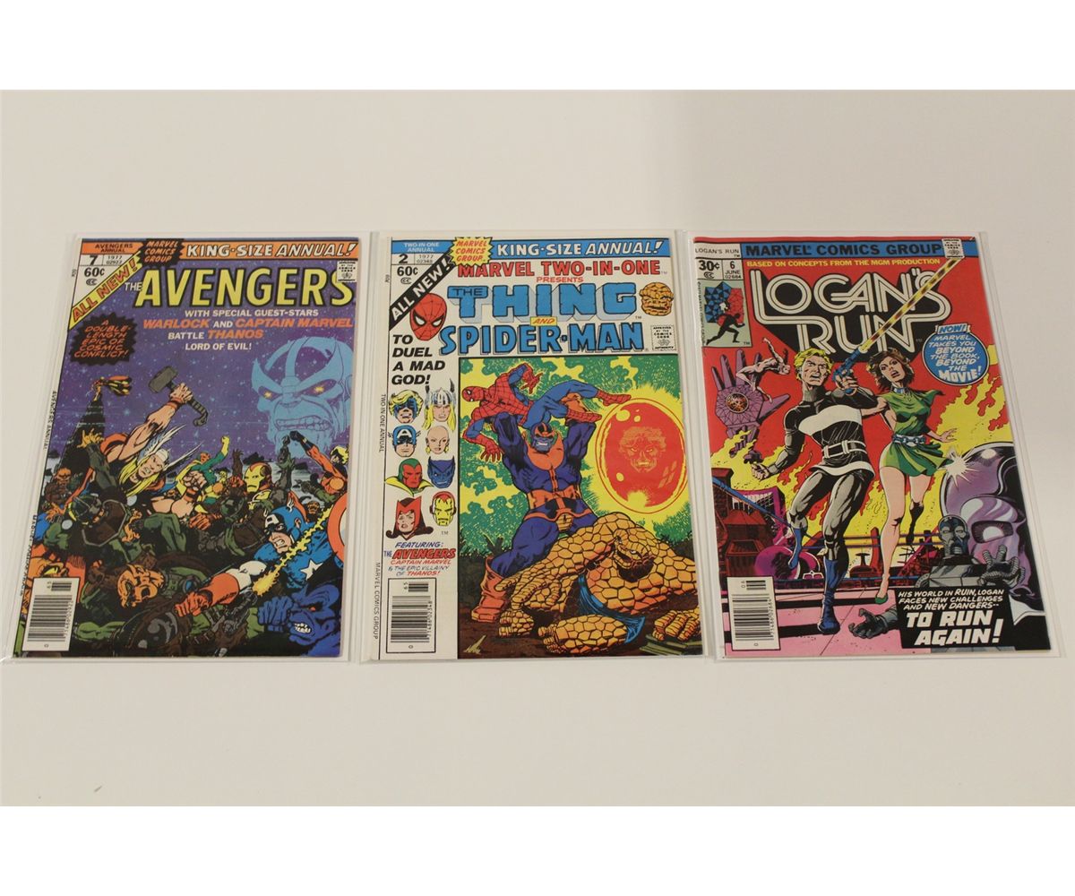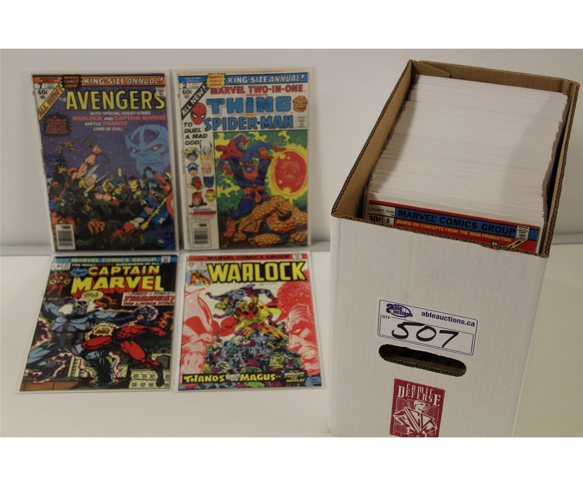 THANOS KEY ISSUES/ STORYLINE GROUP (1970'S-90'S) EXTENSIVE THANOS LOT LOADED WITH KEYS! INCLUDES AVENGERS ANNUAL #7 - 2ND DEATH OF THANOS, LOGANS RUN #6 - 1ST SOLO THANOS STORY, CAPTAIN MARVEL #31-34 - STARLIN'S 1ST THANOS SAGA, STRANGE TALES #178-181 & WARLOCK #9-15 STARLIN'S 2ND THANOS SAGA COMPLETE, INFINITY GAUNTLET/ WAR/ CRUSADE ALL 3 SERIES COMPLETE & THE GAUNTLET SEQUEL - WARLOCK & THE INFINITY WATCH #1-42 (- 7 ISSUES) + WARLOCK CHRONICLES #1-8 COMPLETE SET & MORE! 80 BOOKS TOTAL, NO DUPLICATES, HIGH MID TO HIGH GRADE AVERAGE, MANY NM COPIES, CHOICE LOT! 2013 OVERSTREET TOP END GUIDE VALUE OF OVER $1,000
