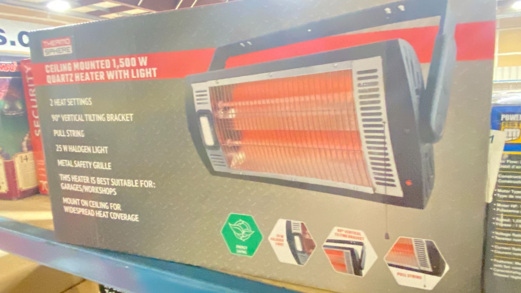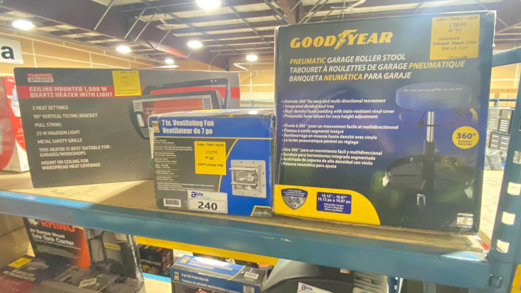 THERMO SPHERE 1,500W CEILING MOUNTED QUARTZ HEATER WITH LIGHT, POWER FIST 7" VENTILATION FAN, & GOODYEAR PNEUMATIC GARAGE ROLLER STOOL *IN BOX*
