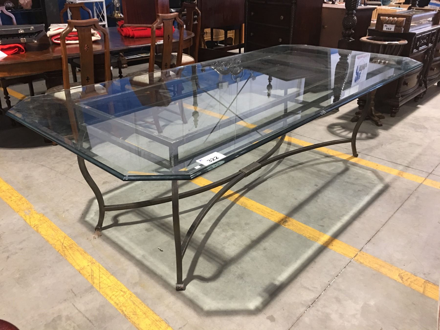 THICK RECTANGULAR GLASS TOP TABLE WITH STEEL BASE (1 SMALL CHIP PRESENT)