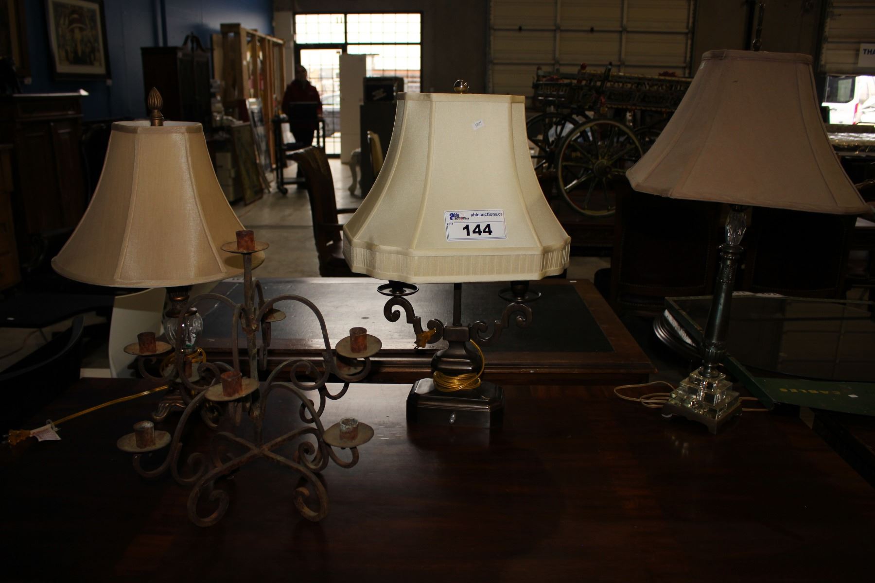 THREE ASSORTED TABLE LAMPS AND CANDLE HOLDER