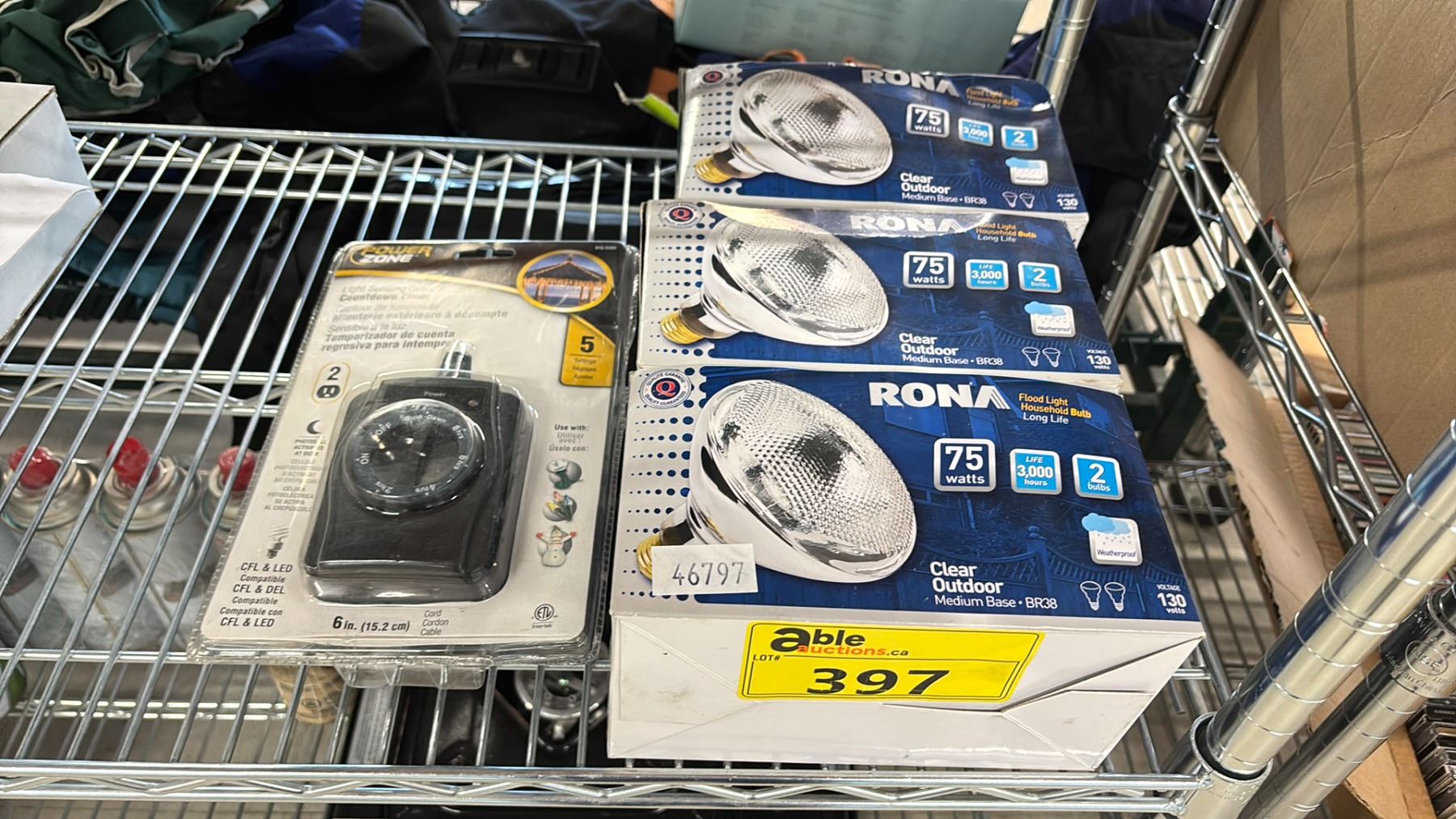 THREE BOXES OF RONA CLEAR FLOOD LIGHTS & A POWER ZONE LIGHT SENSING OUTDOOR TIMER