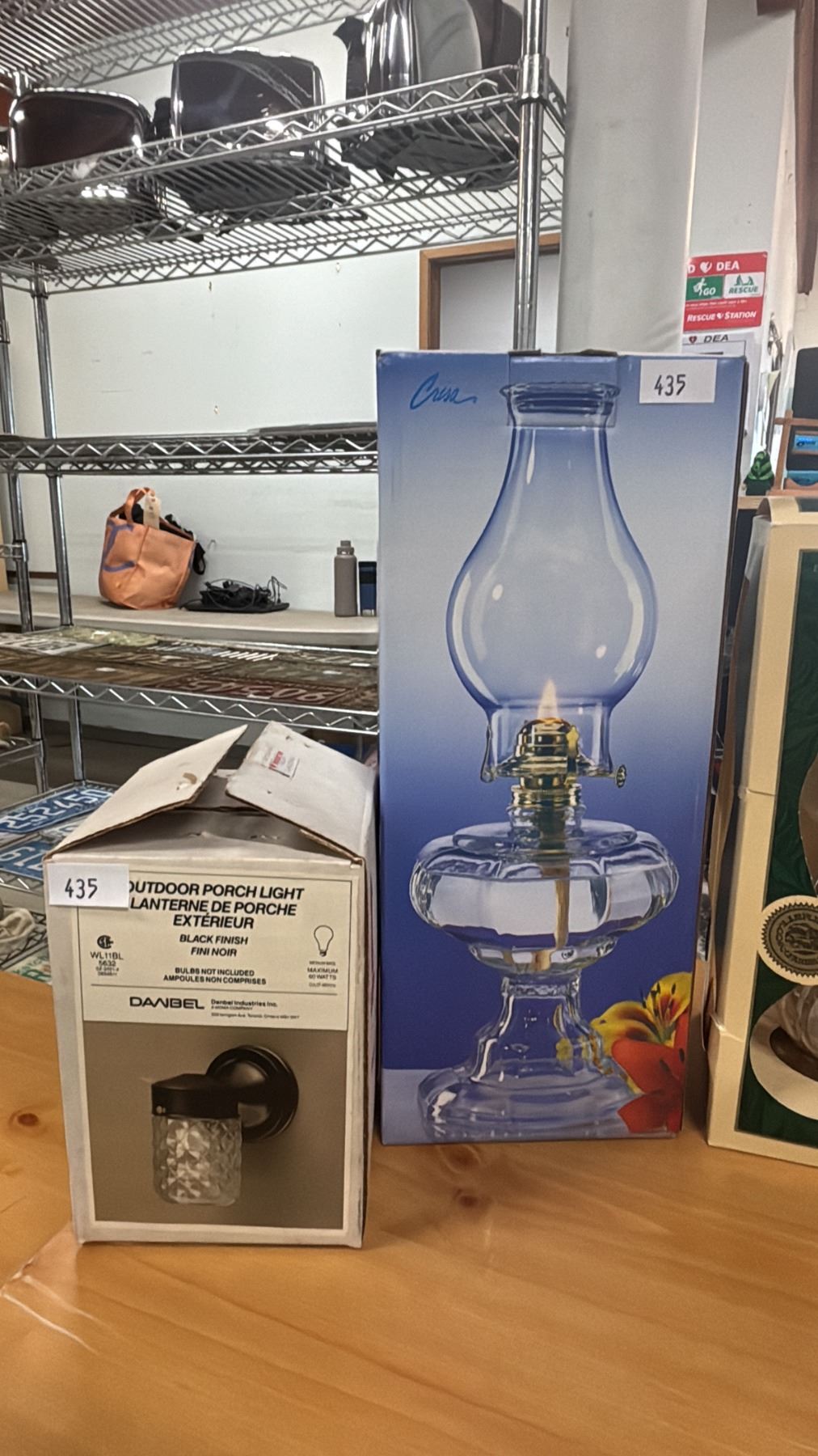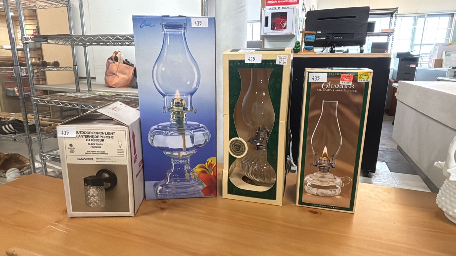 THREE VINTAGE OIL LAMPS & A OUTDOOR PORCH LIGHT