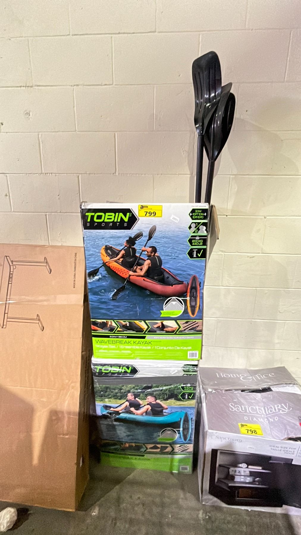 TOBIN SPORTS WAVEBREAK KAYAK & BOX OF TOBIN SPORTS PARTS (UNKNOWN WORKING CONDITION, MAY BE MISSING PIECES)
