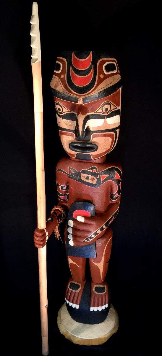 TOM PATTERSON "THE WHALER CHIEF" NUU-CHA-NULTH HERITAGE TOTEM POLE. 8' H WITH 10' HARPOON,. THE WHALER CHIEF IS HOLDING A WHALE'S DORSAL FIN, AND THE BASE MADE OF YELLOW CEDAR. THE LOG ORIGINATES FROM THE DITIDAH TRIBE