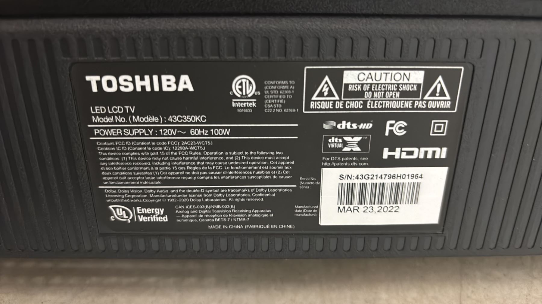 TOSHIBA FIRETV 42" TELEVISION *NO POWER CORD/NO REMOTE/NO STAND*
