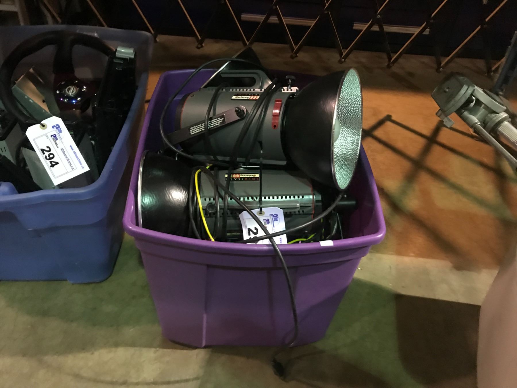 TOTE OF ASSORTED SOLAFLASH STAGE LIGHTS AND BATTERY BOOSTER