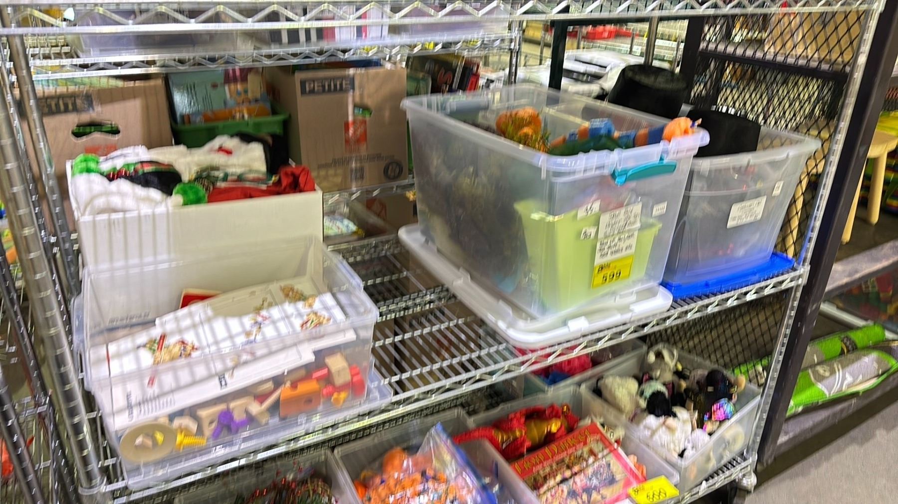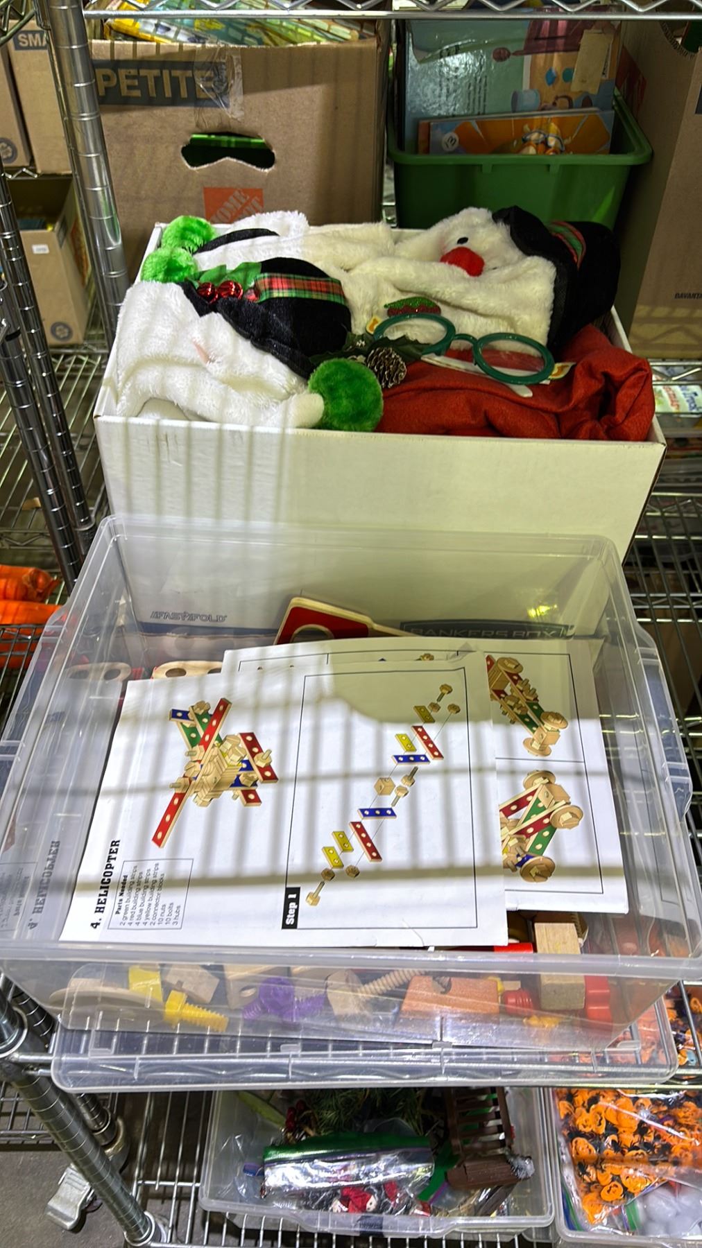 TOTE OF MELISSA & DOUG WOOD BUILDING PIECES & 2 TOTES OF ASSORTED CHILDREN'S PROPS & DECORATION