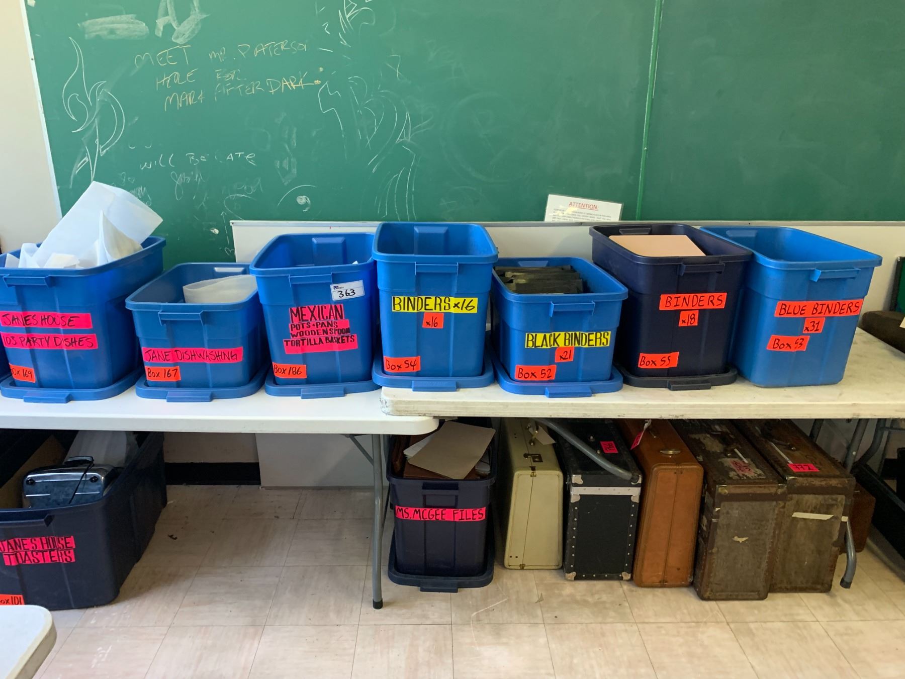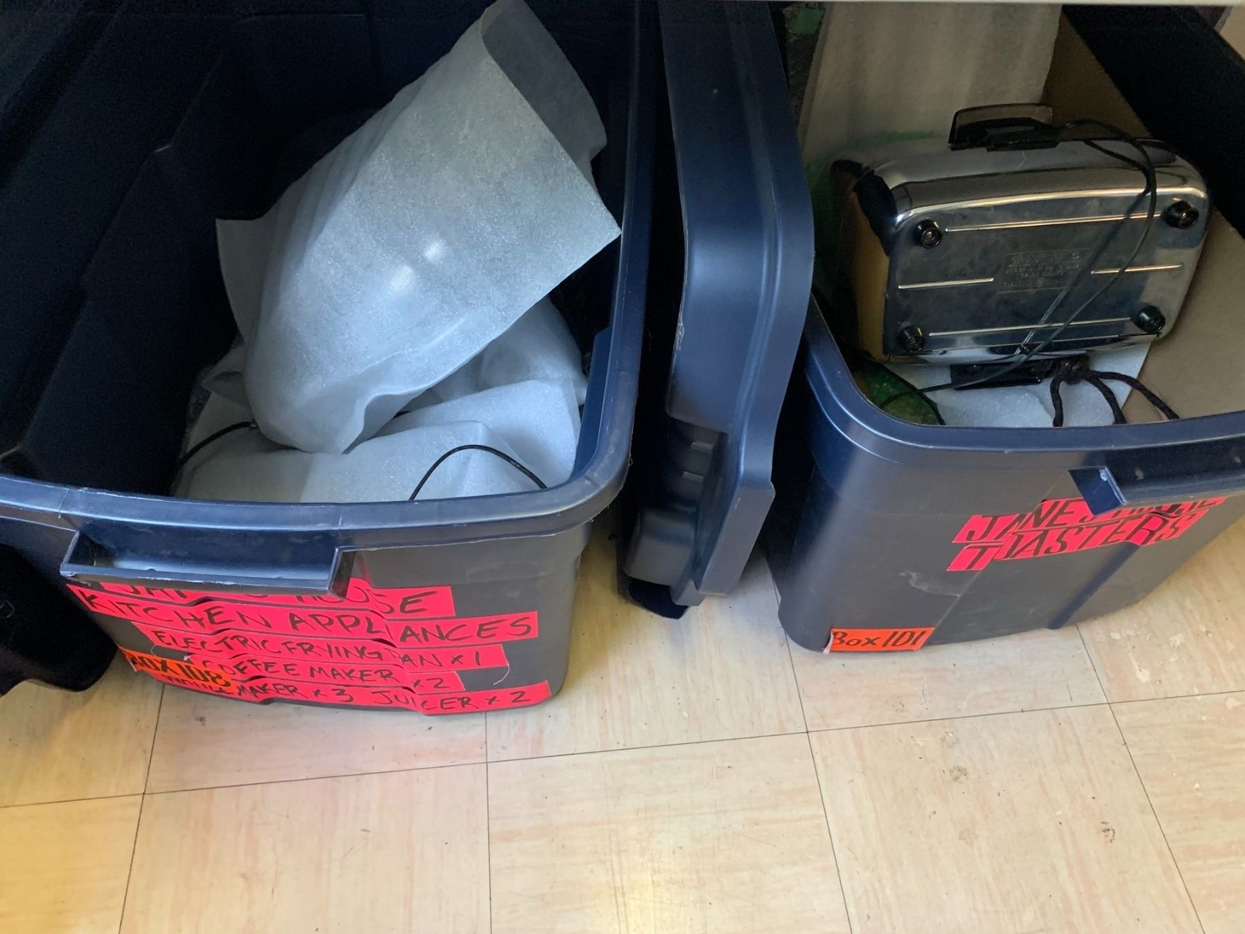 TOTES OF ASSORTED ITEMS INCLUDING; HAND MIRRORS, TOASTERS, LUGGAGE, BINDERS & MORE (TABLES NOT INCLUDED)