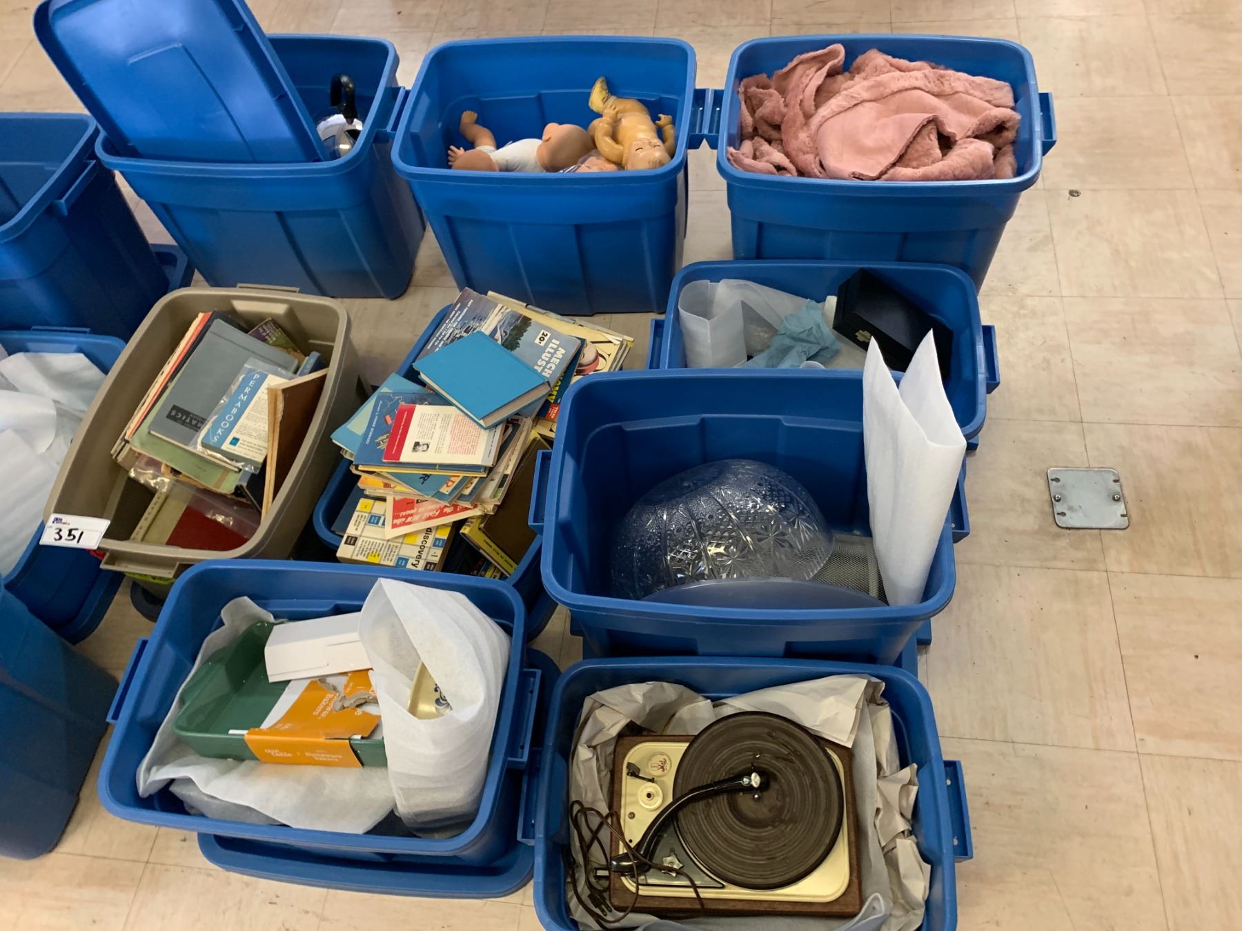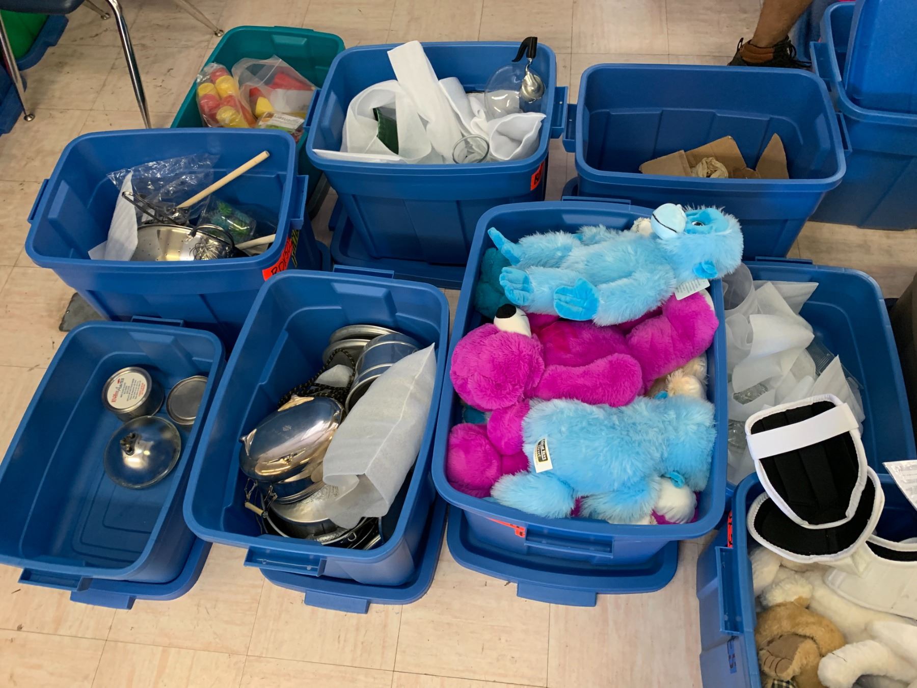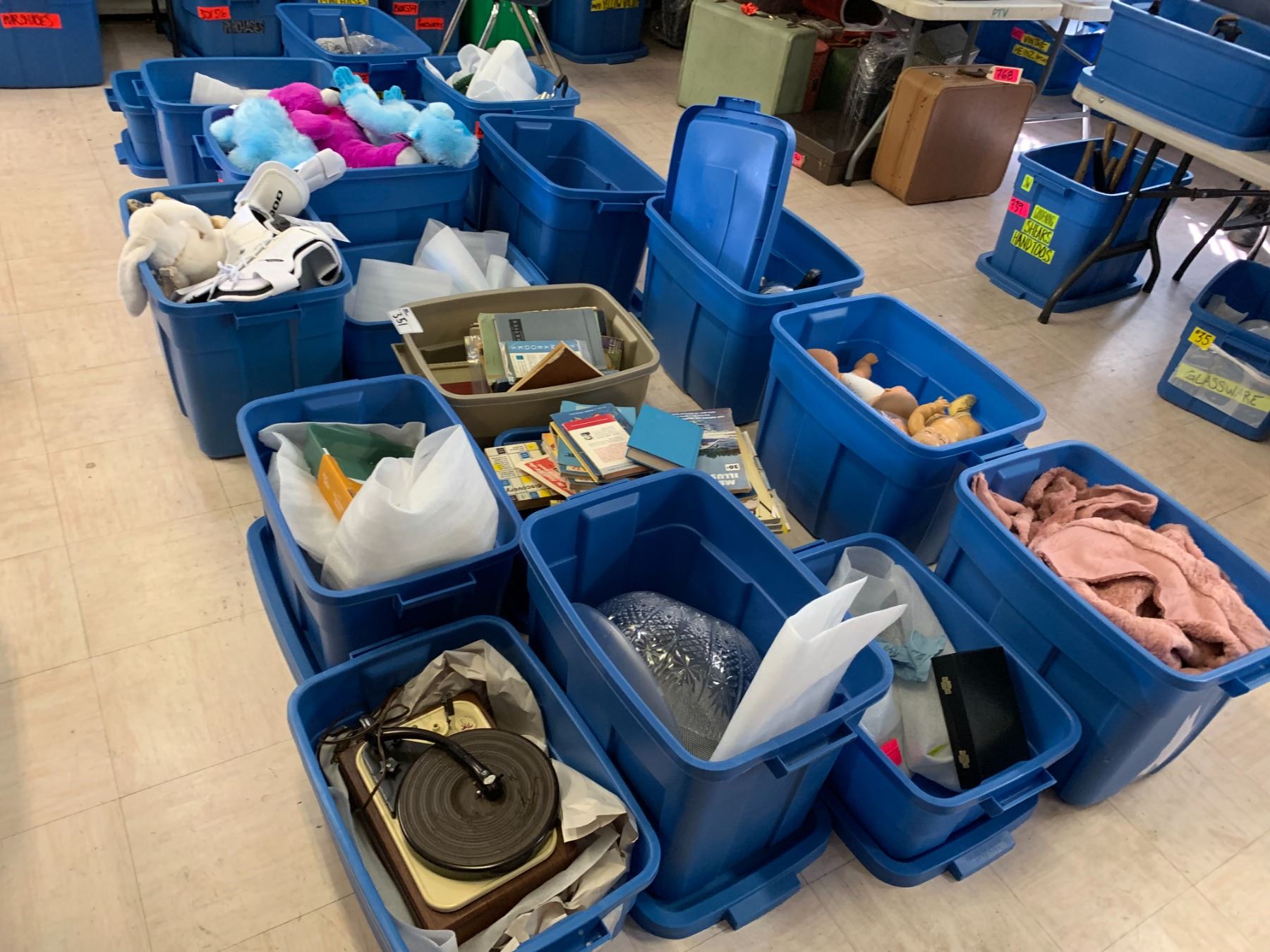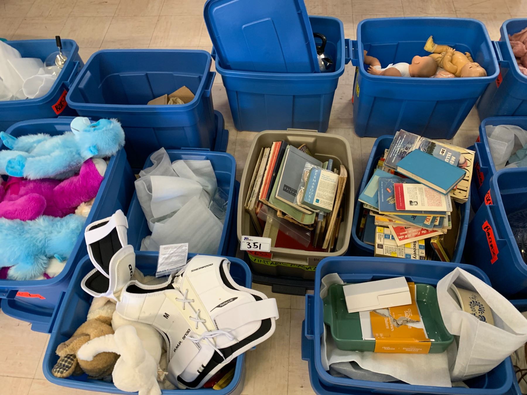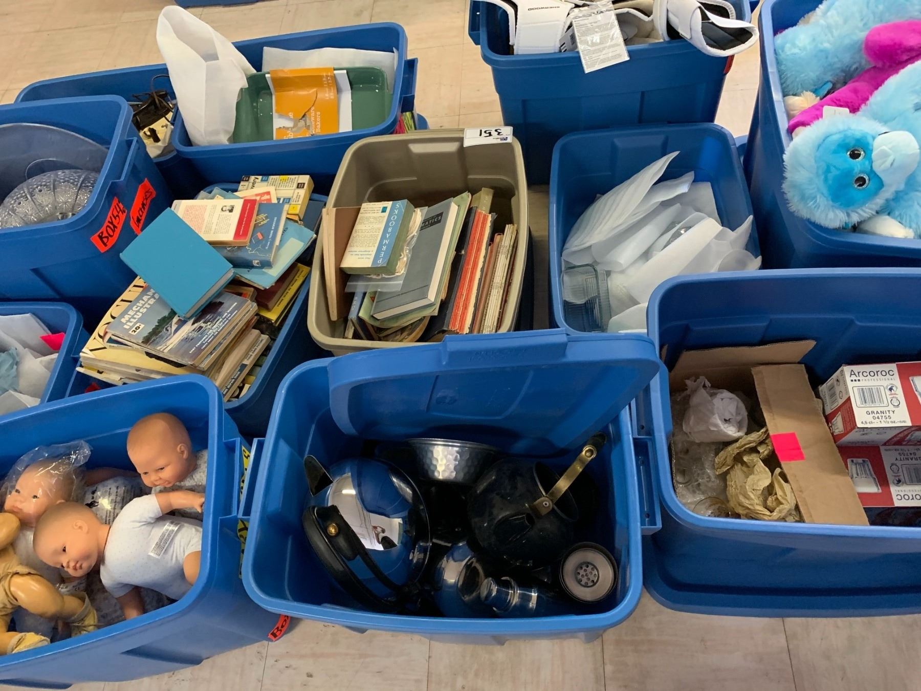 TOTES OF ASSORTED ITEMS INCLUDING; STUFFED ANIMALS, BABY DOLLS, BOOKS, COOKWARE & MORE