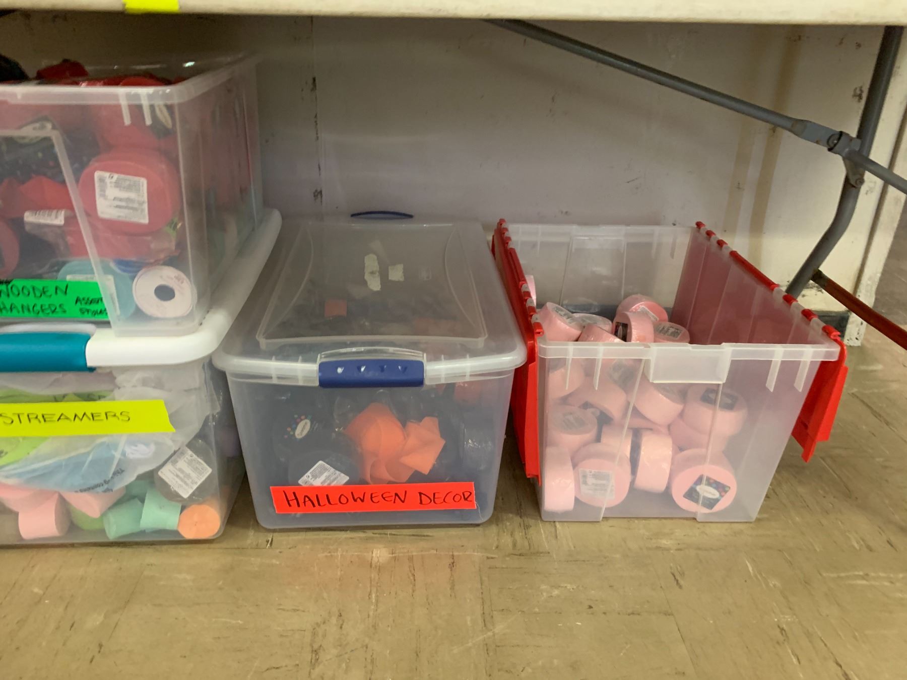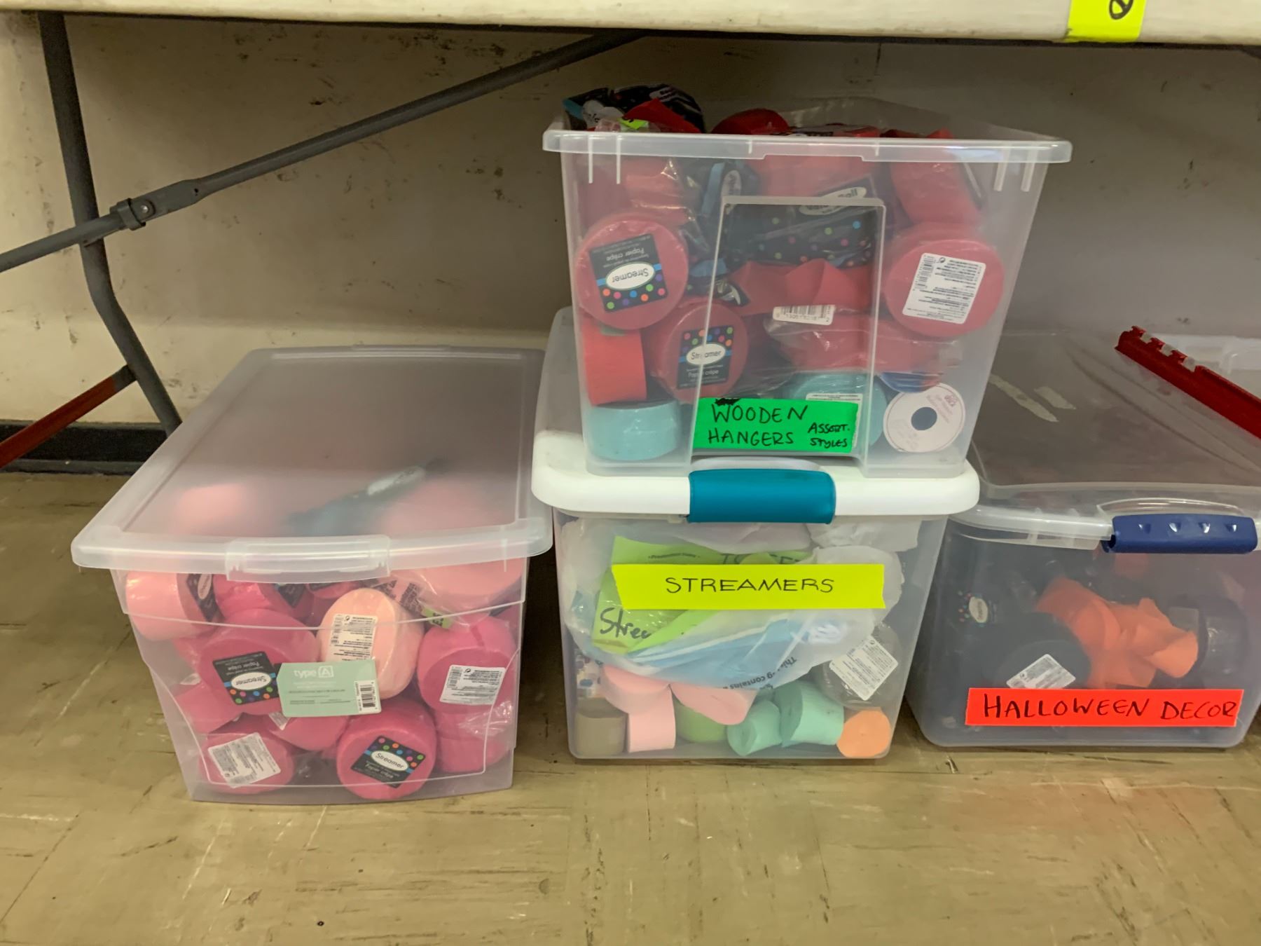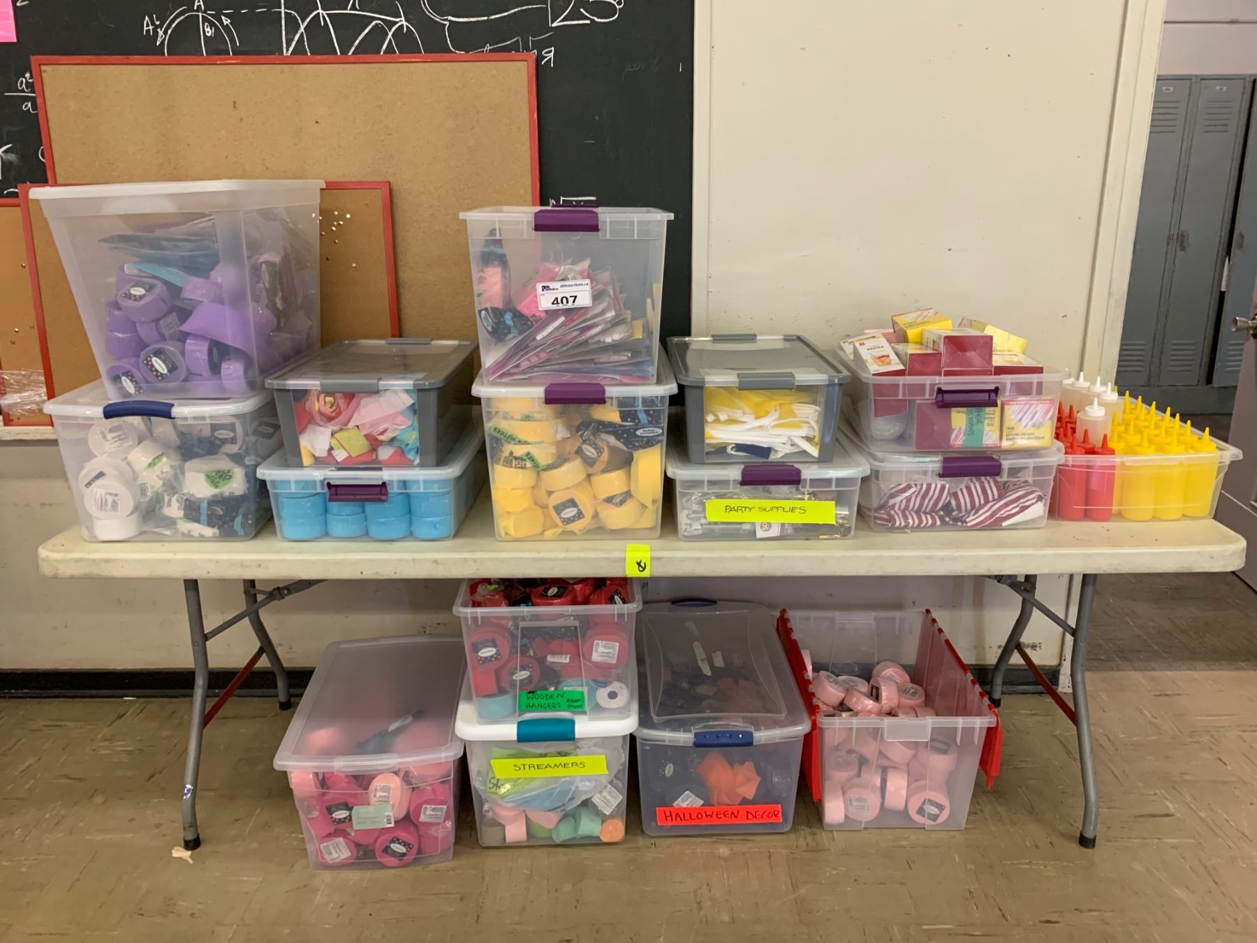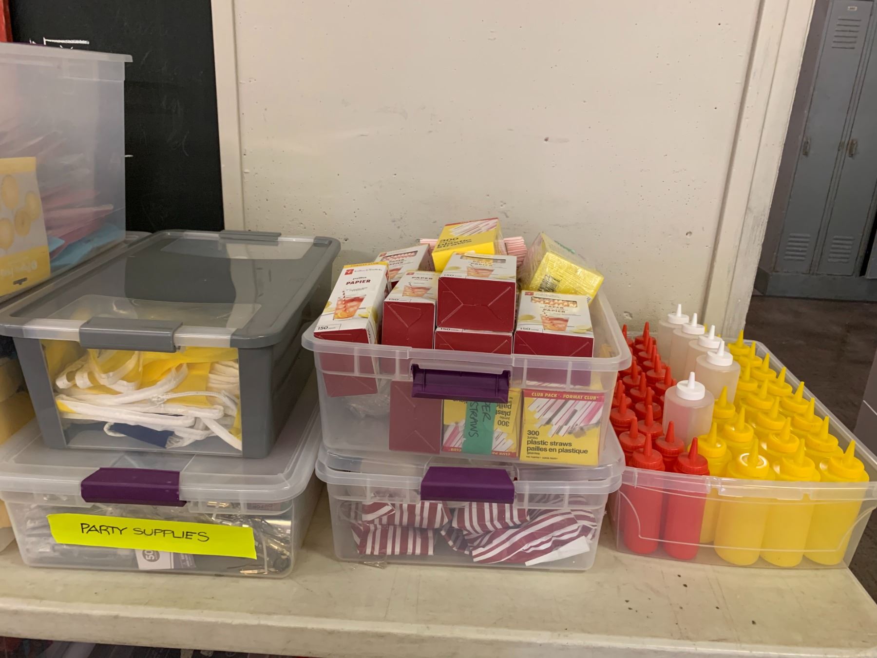 TOTES OF ASSORTED PARTY SUPPLIES INCLUDING; STREAMERS, STRAWS, CONDIMENT SQUEEZERS & MORE (TABLE NOT INCLUDED)