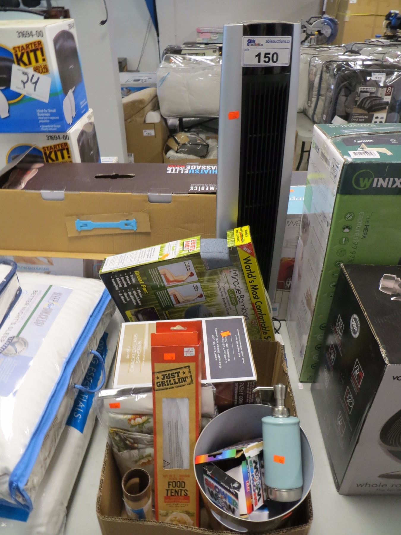 TOWER FAN/MIRACLE BAMBOO ORTHEPEDIC CUSHION/BOX OF KITCHEN MISC