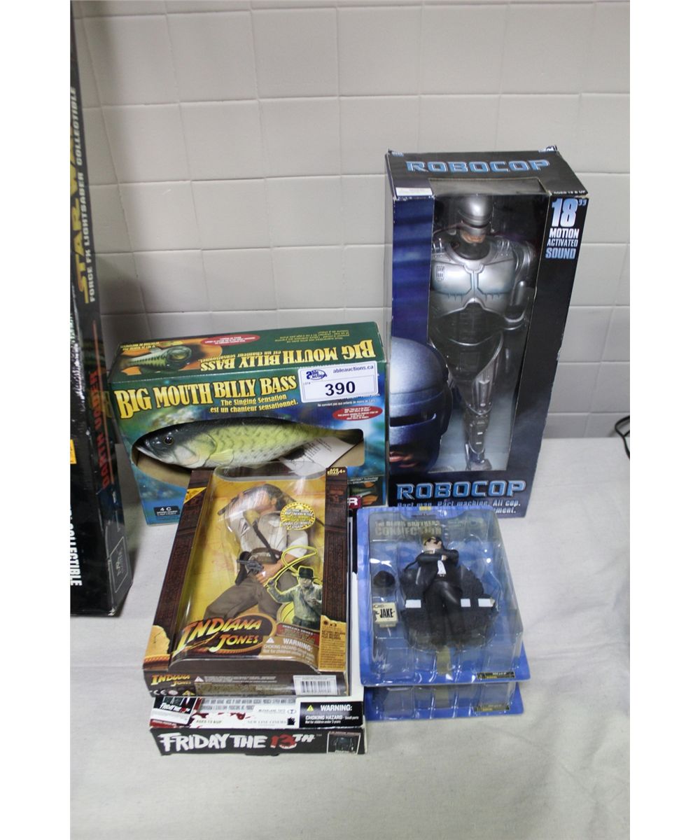 TOY LOT OF MISC. ACTION FIGURES- BIG MOUTH BASS, ROBOCOP, INDIANA JONES ETC.