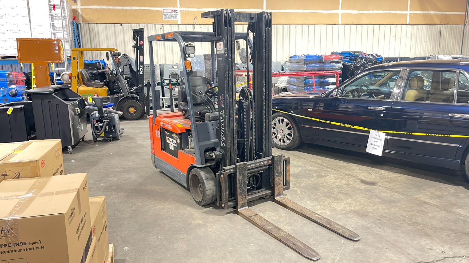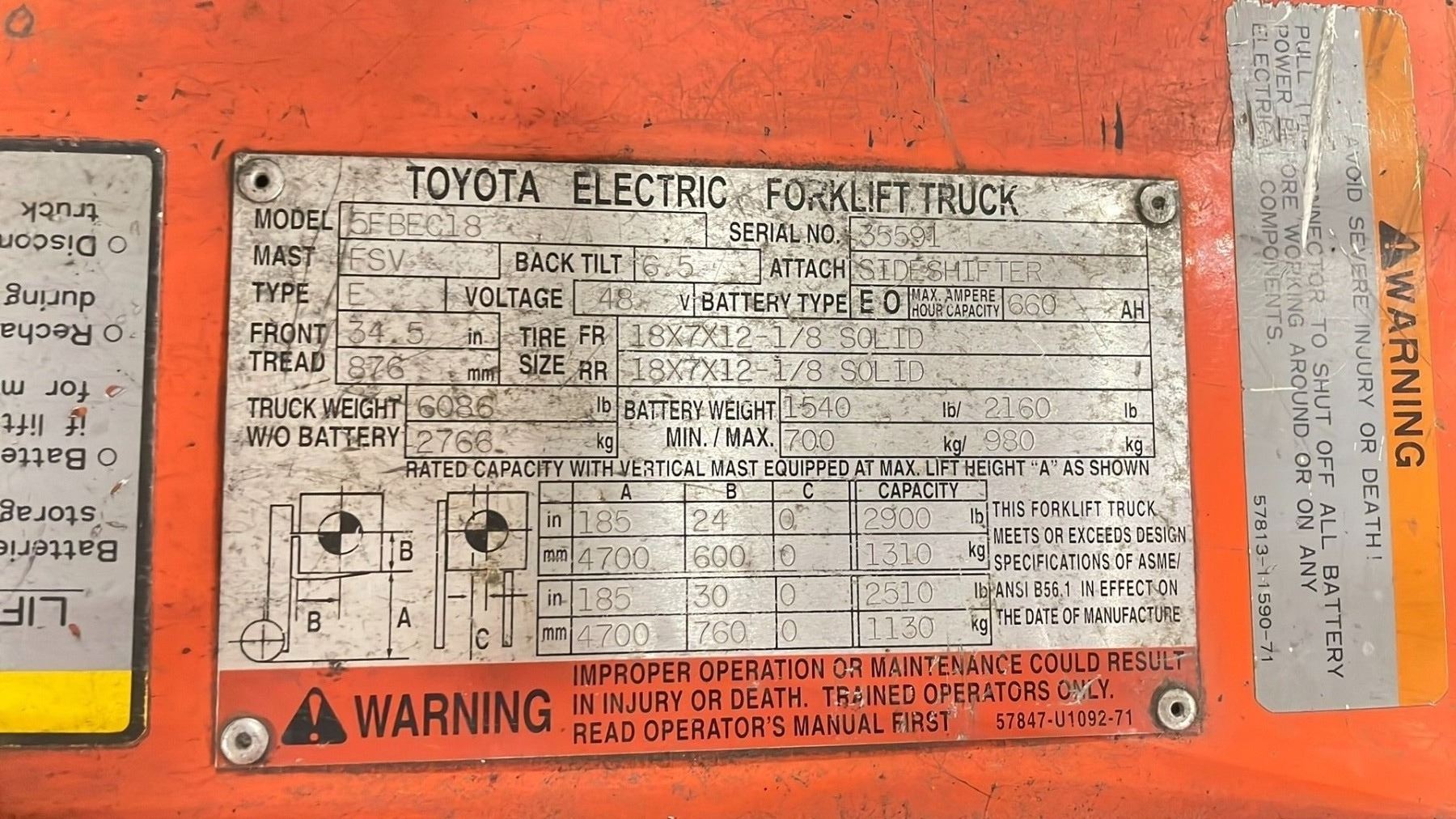 TOYOTA 5FBEC18 FORKLIFT, ORANGE, VIN 35591 11,223.00 HOURS (NOT VERIFIED), ELECTRIC (E), HAS KEYS, FEATURES: GOES FORWARD, GOES IN REVERSE, RUBBER TIRES, BRAKES WORK, 2900LB LIFTING CAPACITY, 48VOLT, MINOR SCRATCHES & DENTS, ENERSYS SINGLE SHIFT, 24 CELL/48 VOLT INDUSTRIAL BATTERY CHARGER, 43" LONG, 5" WIDE FORKS, 185" HEIGHT OF MAST