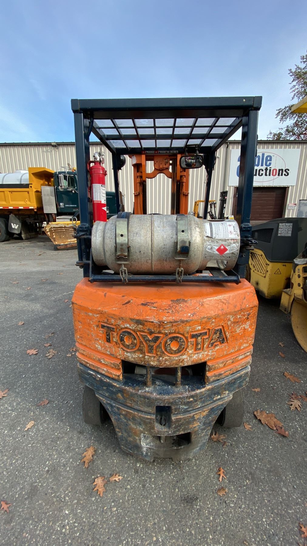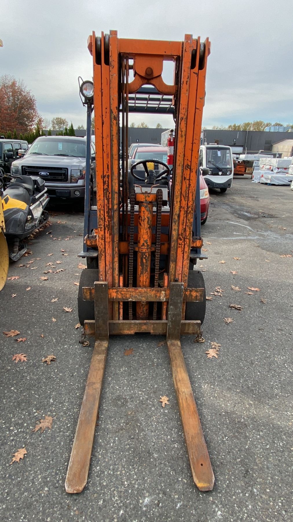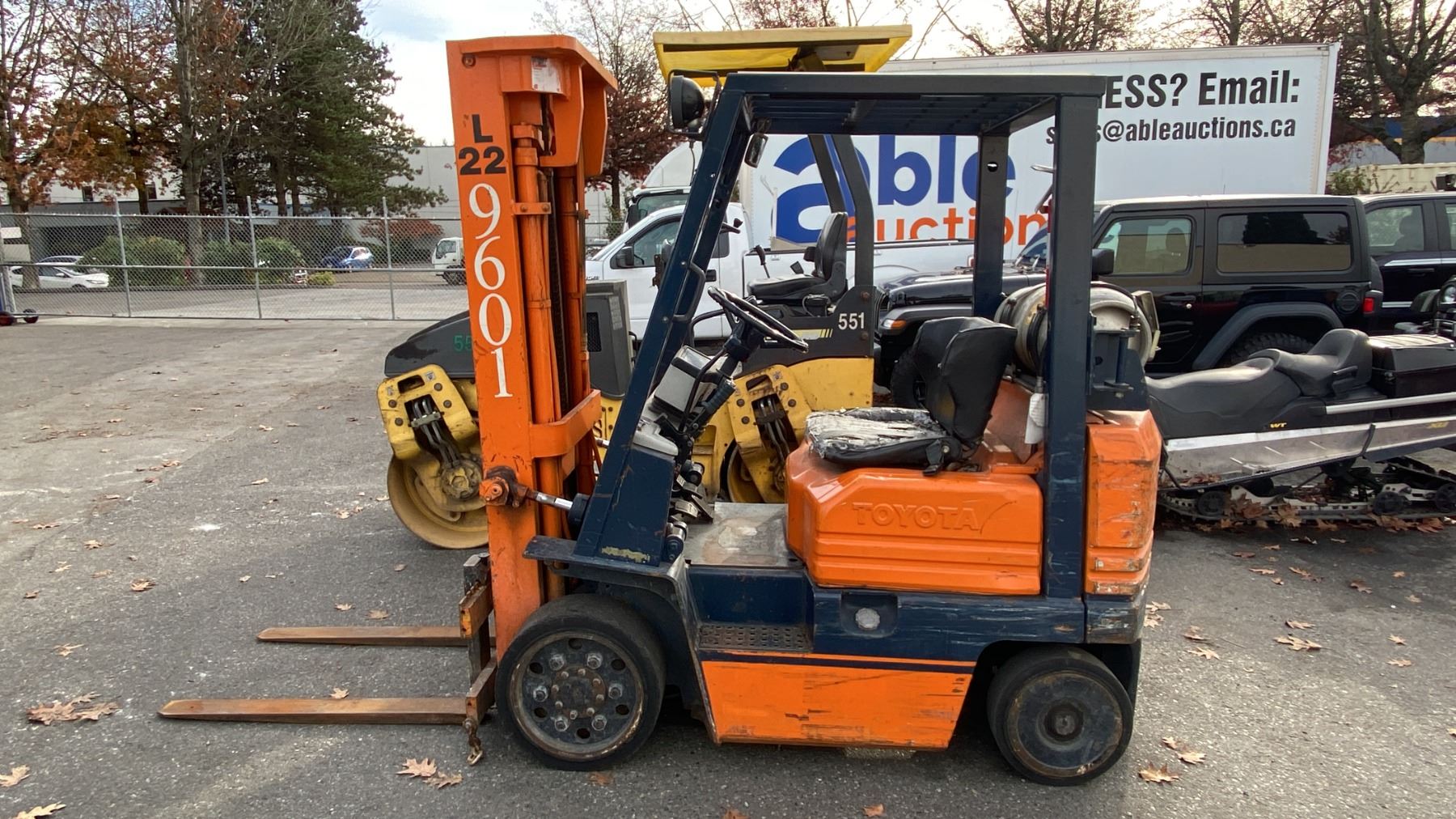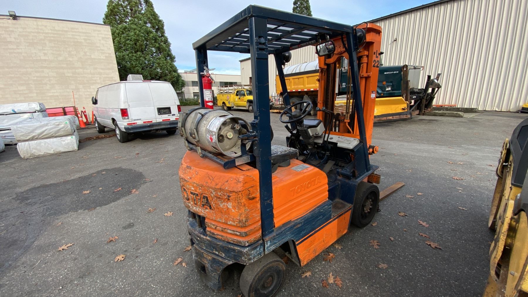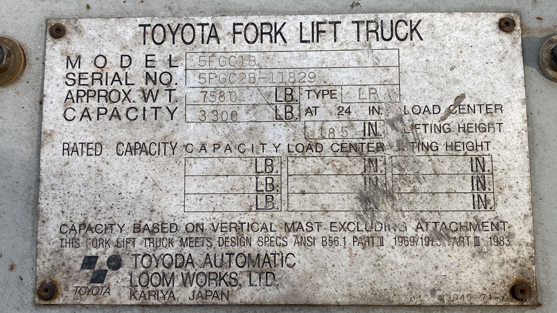 TOYOTA 5FGC18 FORKLIFT, ORANGE, VIN 5FGC25-11829, 8,253.00 HOURS (NOT VERIFIED), PROPANE (P), NO REGISTRATION, HAS KEYS, FEATURES: GOES FORWARD, GOES IN REVERSE, FIRE EXTINGUISHER, RUBBER TIRES, BRAKES WORK, HISTORY: X-CITY, LP COUNTER BALANCE, AUTOMATIC, MINOR SCRATCHES & DENTS, TIRES ARE WORN & GOUGED, 3300LBS CAPACITY AT 24" LOAD CENTER, 185" MAST HEIGHT