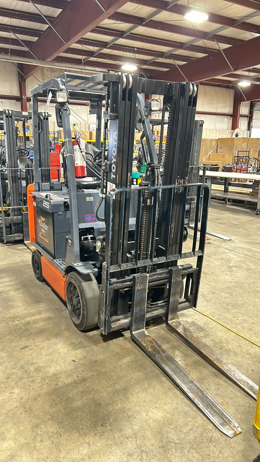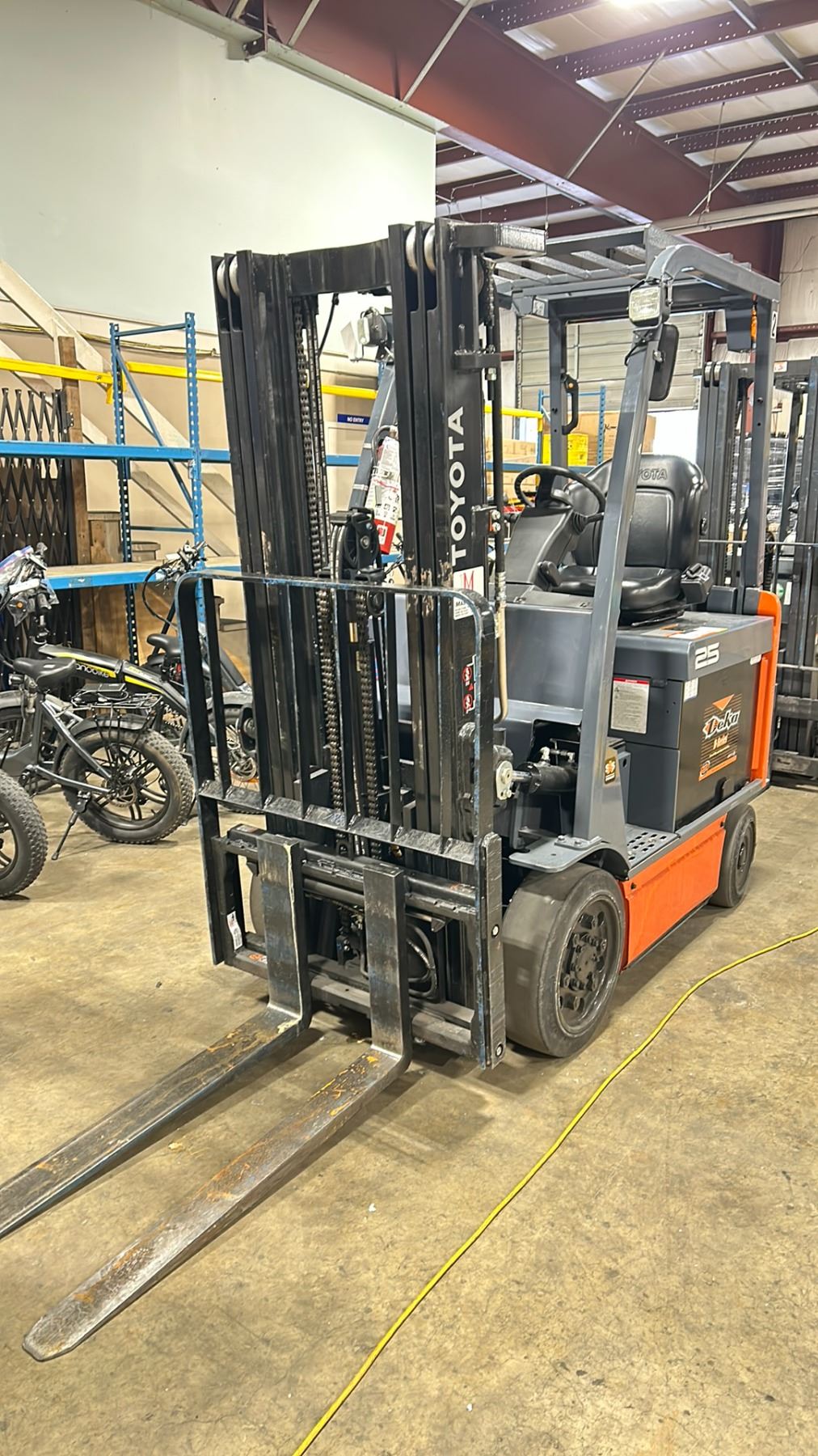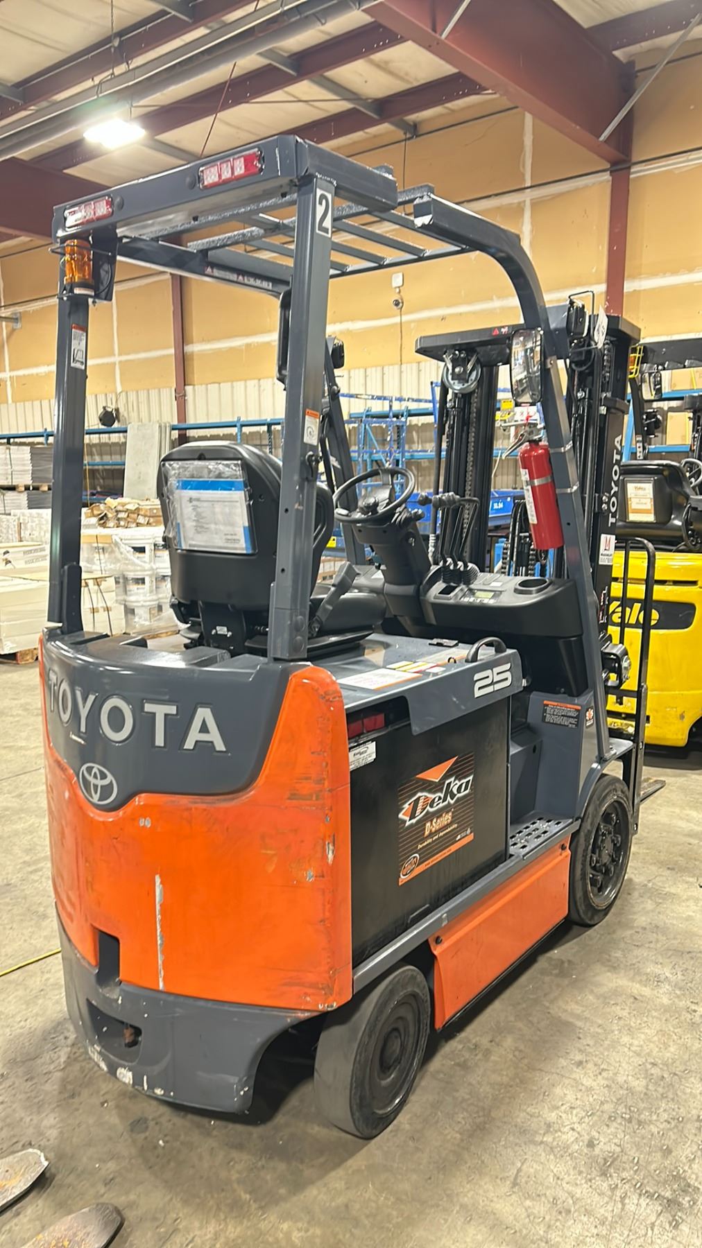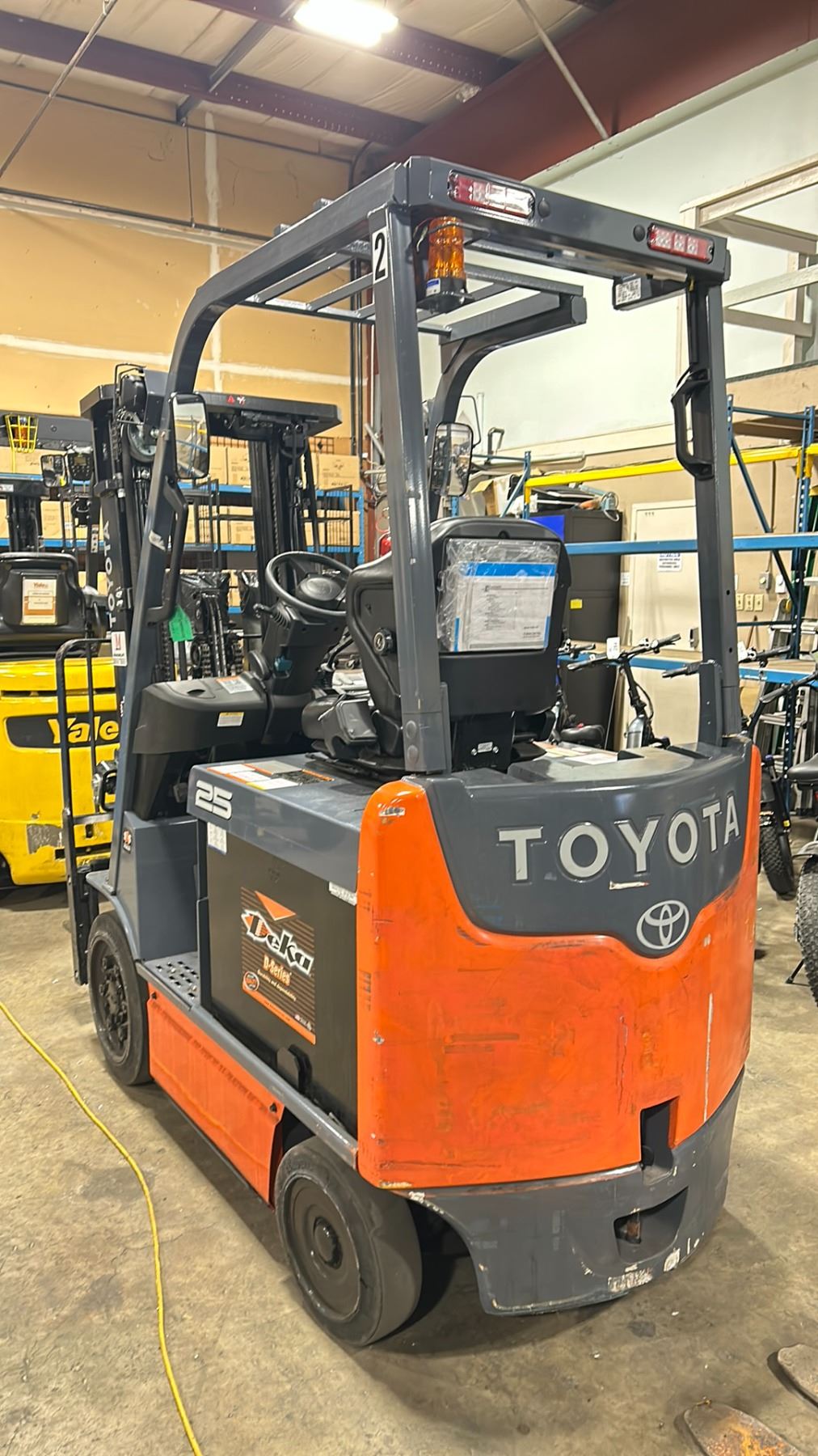 TOYOTA 8FBCU25 FORKLIFT, ORANGE, VIN 79397 1,063.00 HOURS (NOT VERIFIED), ELECTRIC (E) FEATURES: GOES FORWARD, GOES IN REVERSE, FIRE EXTINGUISHER, RUBBER TIRES, BRAKES WORK MAX CAPACITY 4400LBS, MAX HEIGHT 189" INCLUDES A CHLORIDE 24CHR1230-3A MC3797 48V BATTERY CHARGER