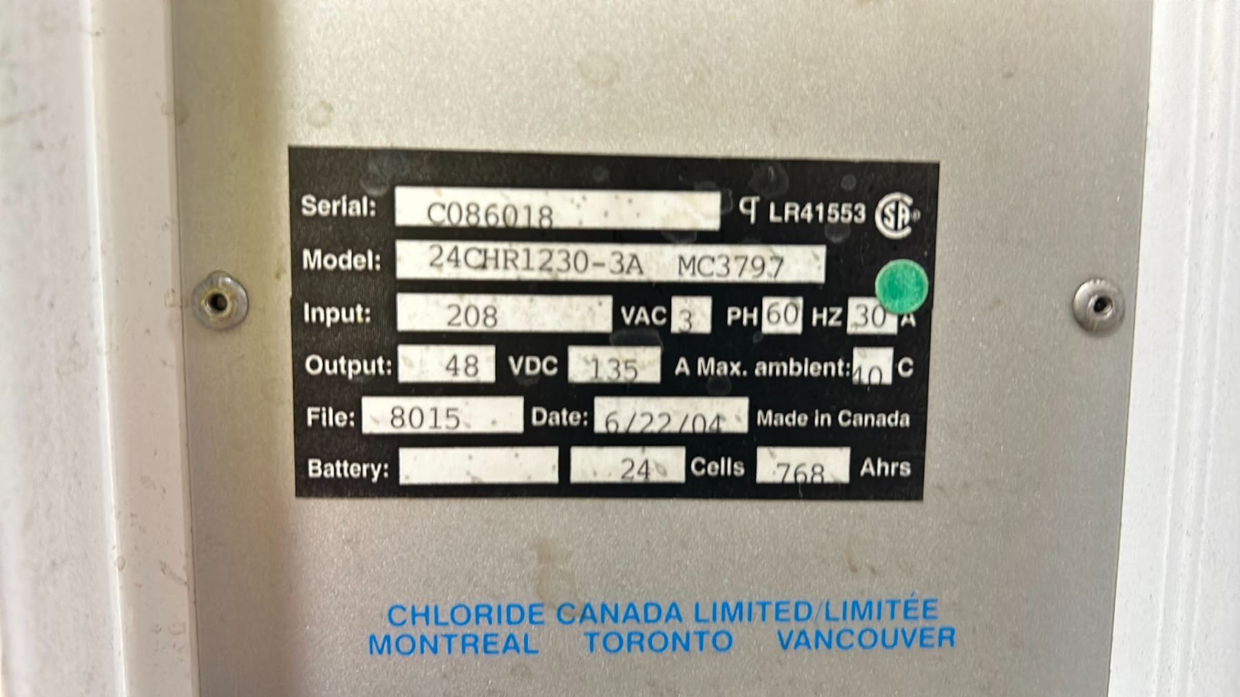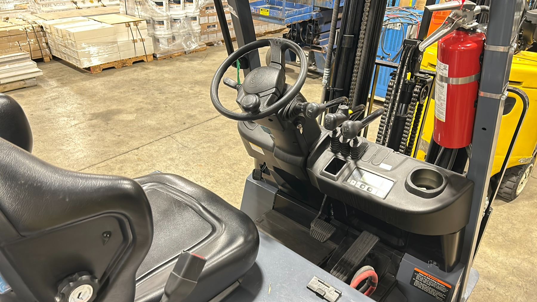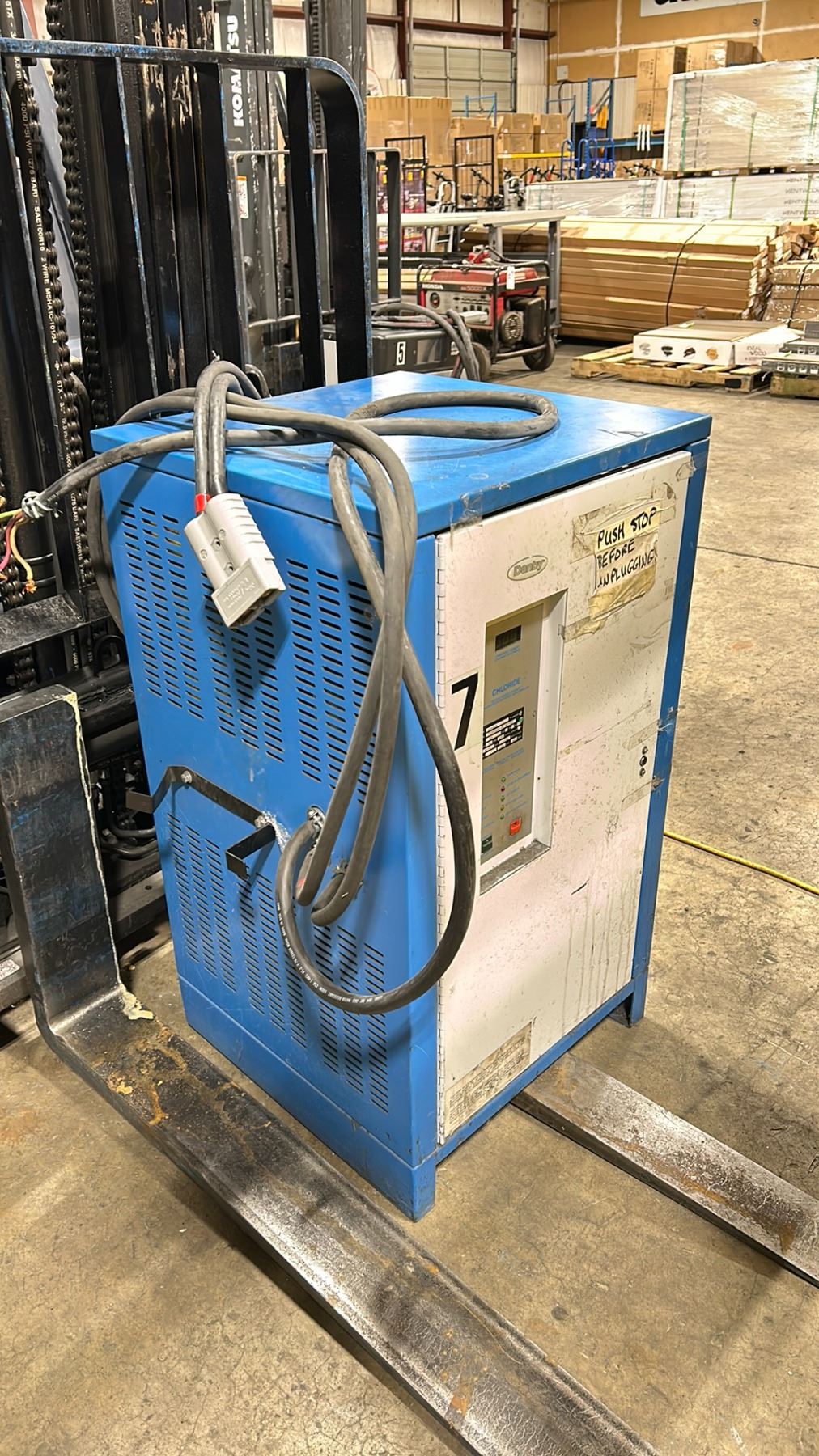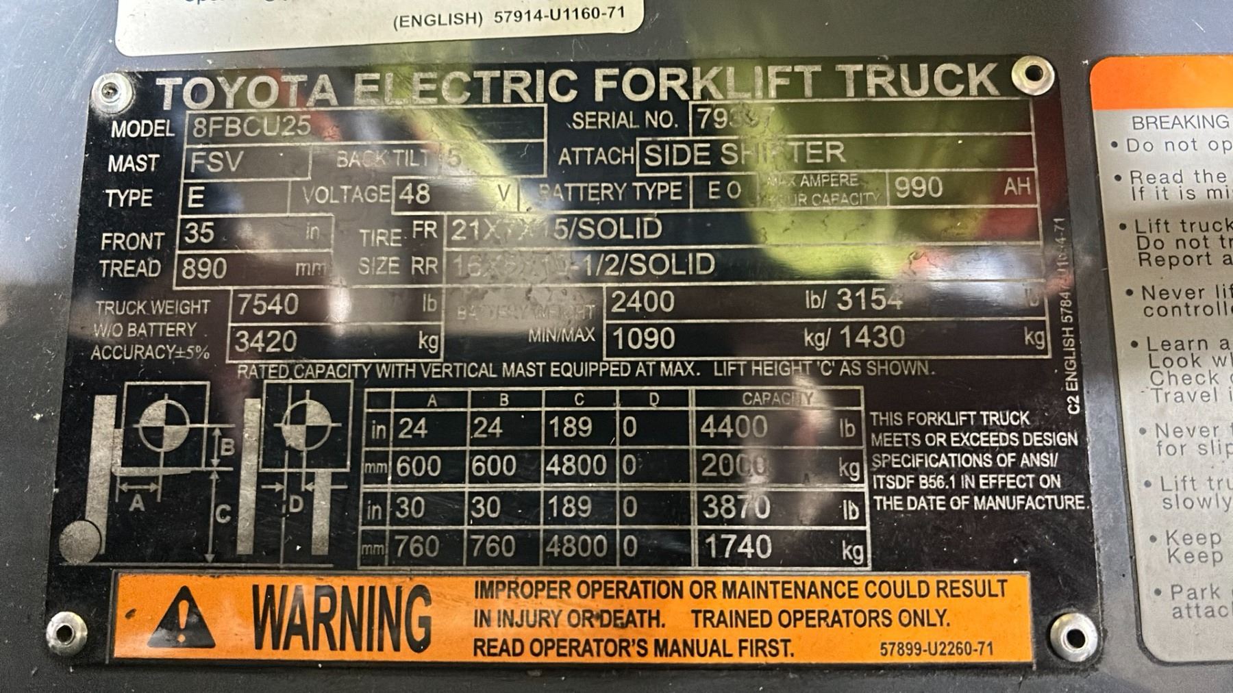 TOYOTA 8FBCU25 FORKLIFT, ORANGE, VIN 79397 1,063.00 HOURS (NOT VERIFIED), ELECTRIC (E) FEATURES: GOES FORWARD, GOES IN REVERSE, FIRE EXTINGUISHER, RUBBER TIRES, BRAKES WORK MAX CAPACITY 4400LBS, MAX HEIGHT 189" INCLUDES A CHLORIDE 24CHR1230-3A MC3797 48V BATTERY CHARGER