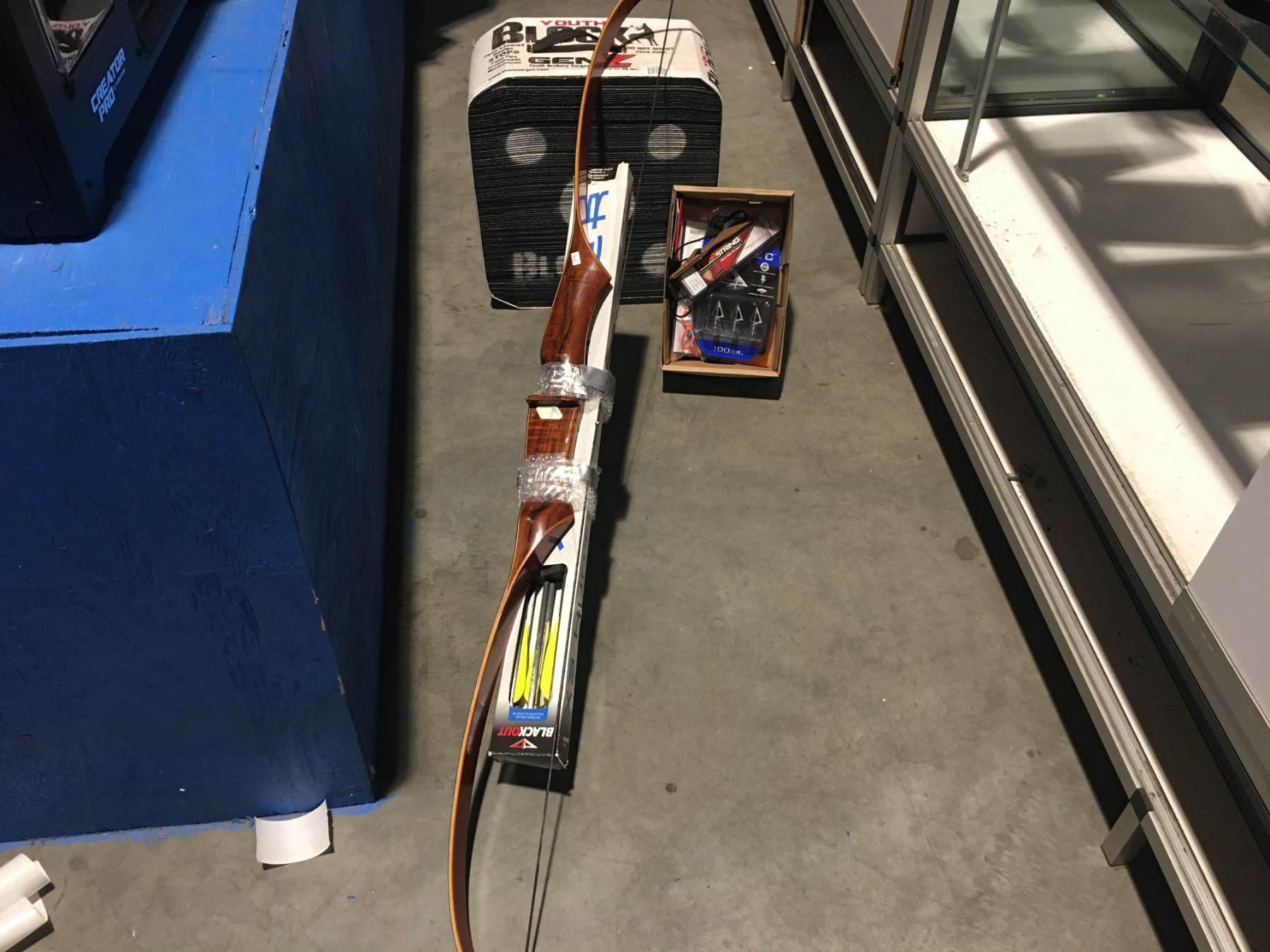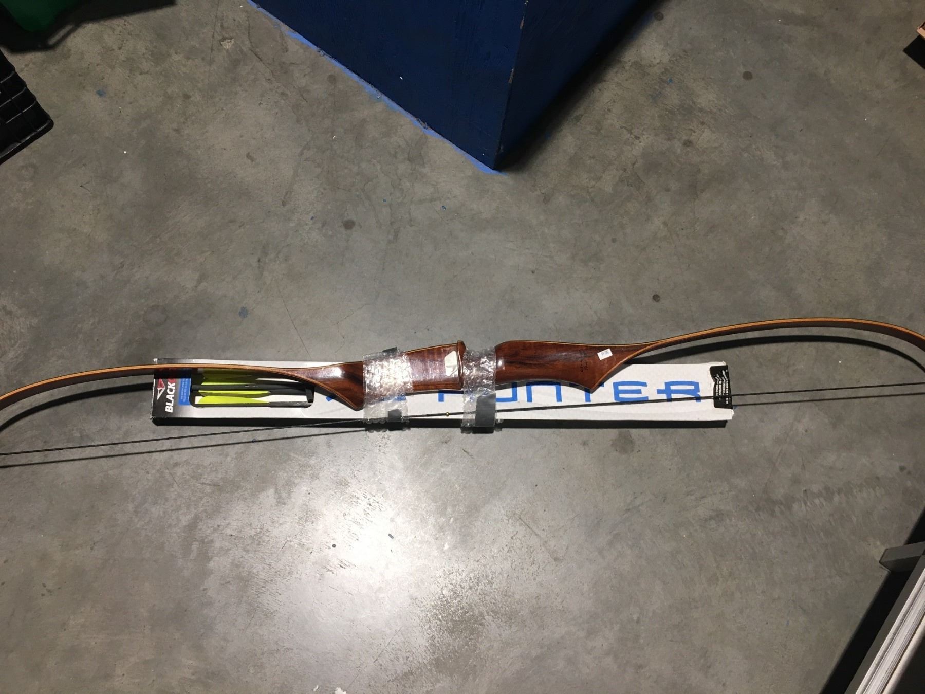 TRADITIONAL HUNTING BOW KIT INCL: 43LB BOW, BOW STRINGER, 6 PRACTICE ARROWS, SHOOTING GLOVE, ARM
