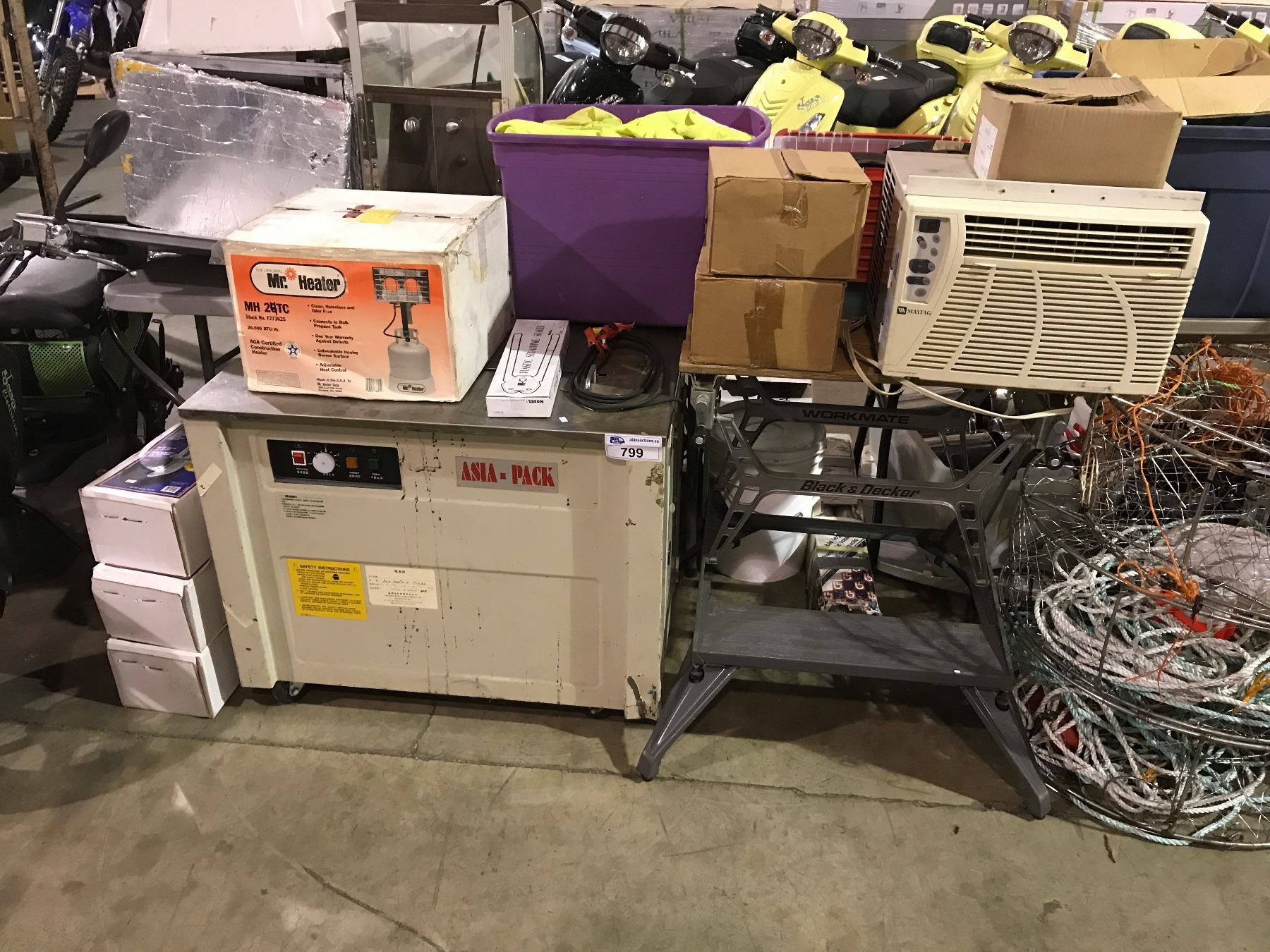 TRAILER JACKS, PROPANE HEATER, WORK BENCH AND ASIA PACK PLASTIC BANDING MACHINE WITH TOOLS