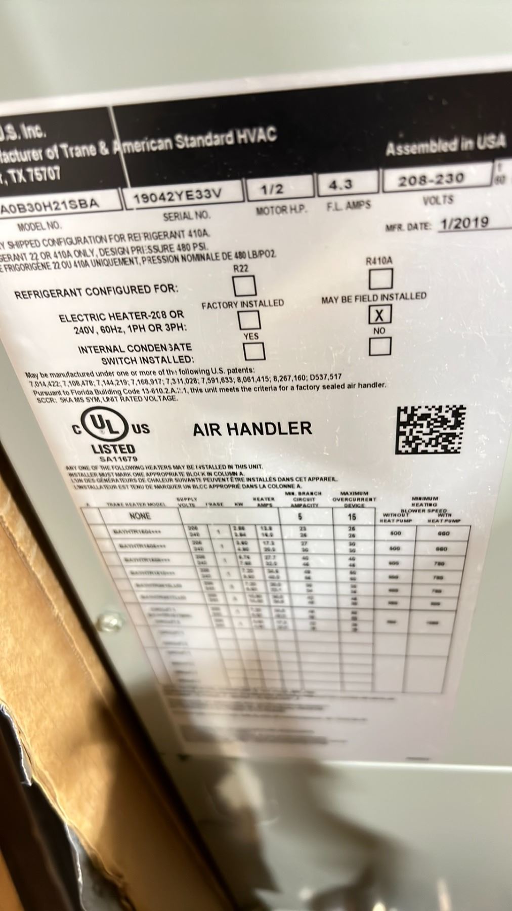 TRANE TEM6A0B30H21SB AIR HANDLER HEATING UNIT 1/2 HP MOTOR