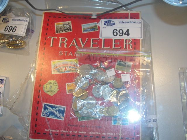 TRAVELLERS STAMP ALBUM COLLECTION FILLED WITH STAMPS AND ONE BAG OF WORLD COINS