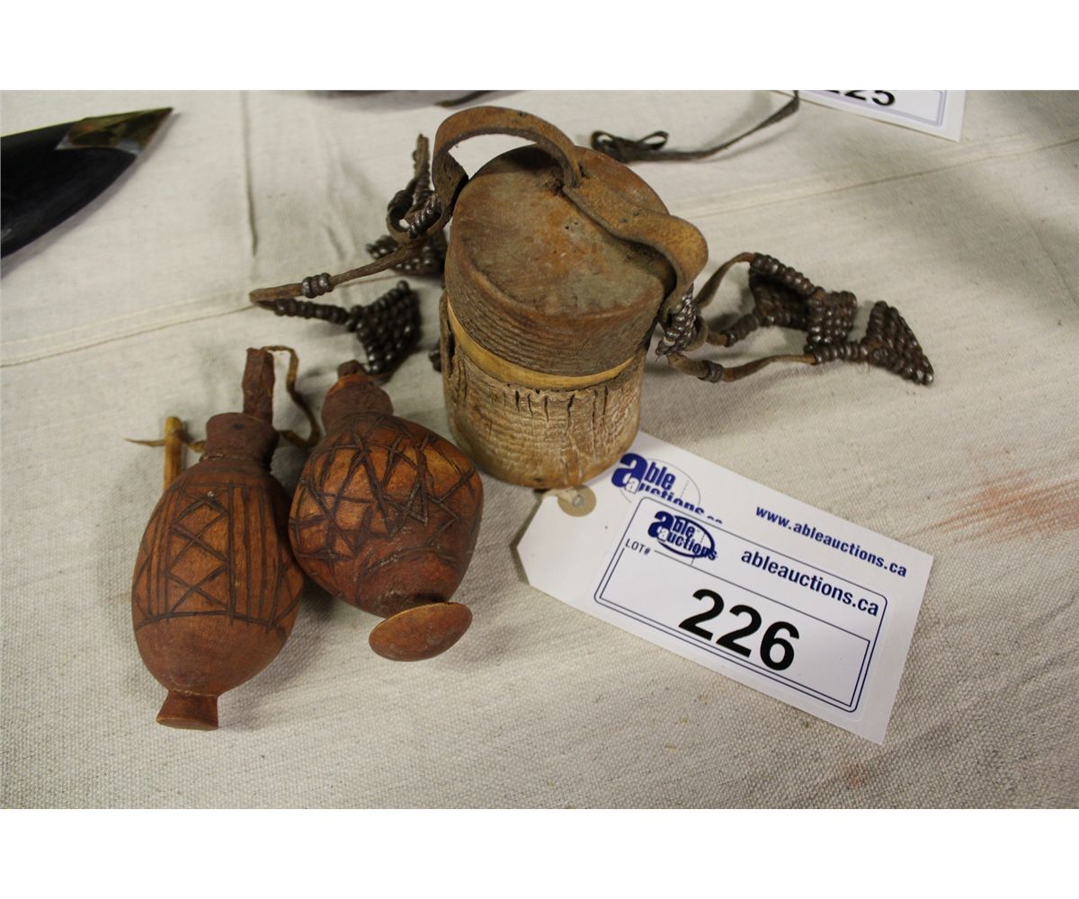 TRAVELLING WAHIMBA BONE, LEATHER AND WOOD POUCH FEATURING METAL BEADS PLUS 2 WAHIMBA SNUFF CARRIERS