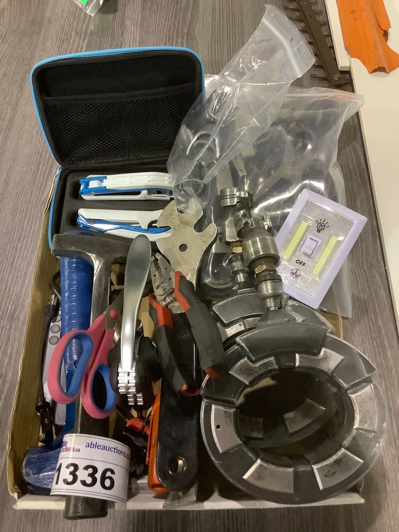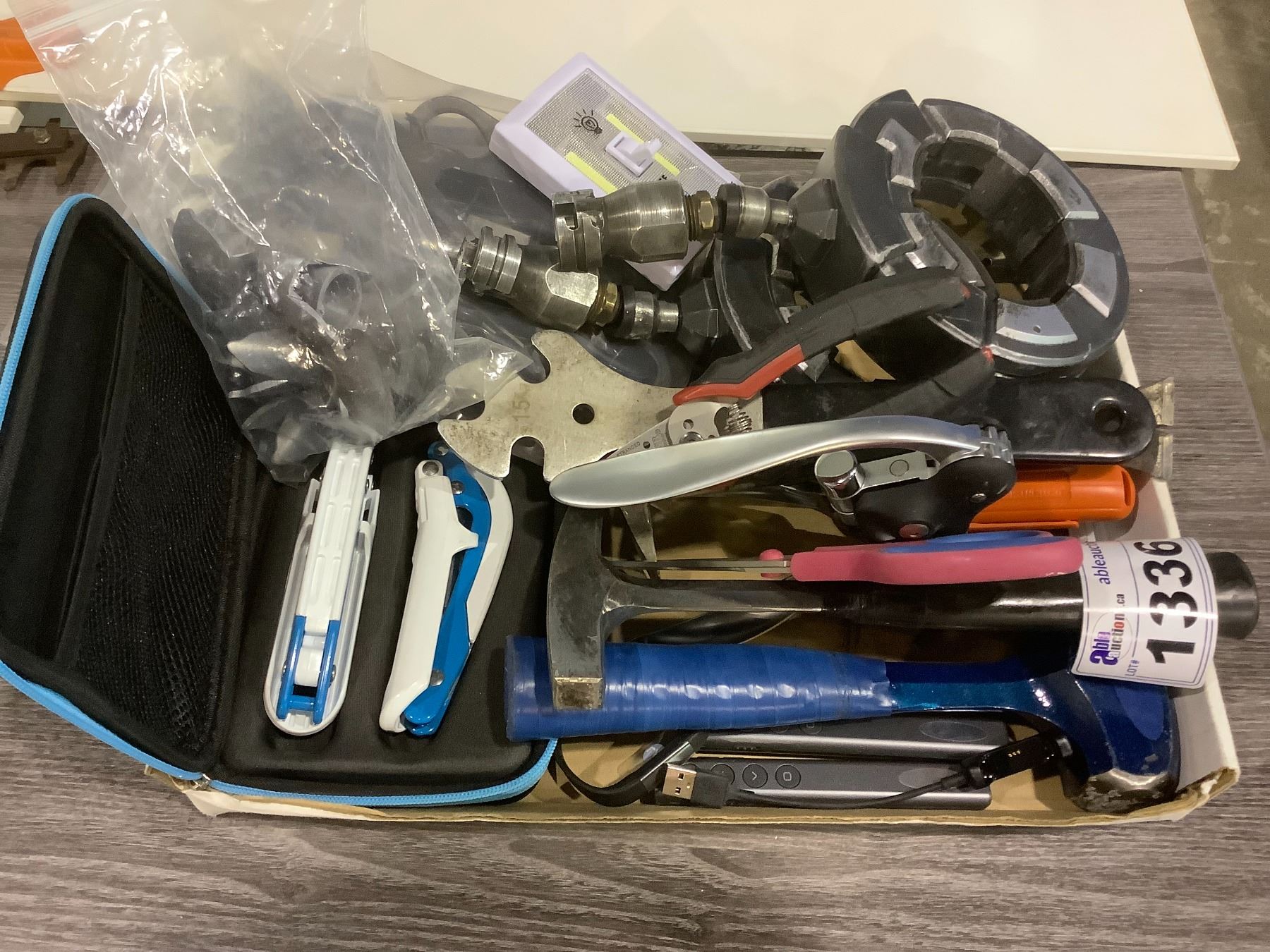 TRAY OF ASSORTED SET DEC PROP ITEMS, TOOLS, POINTERS/CLICKERS, & MORE
