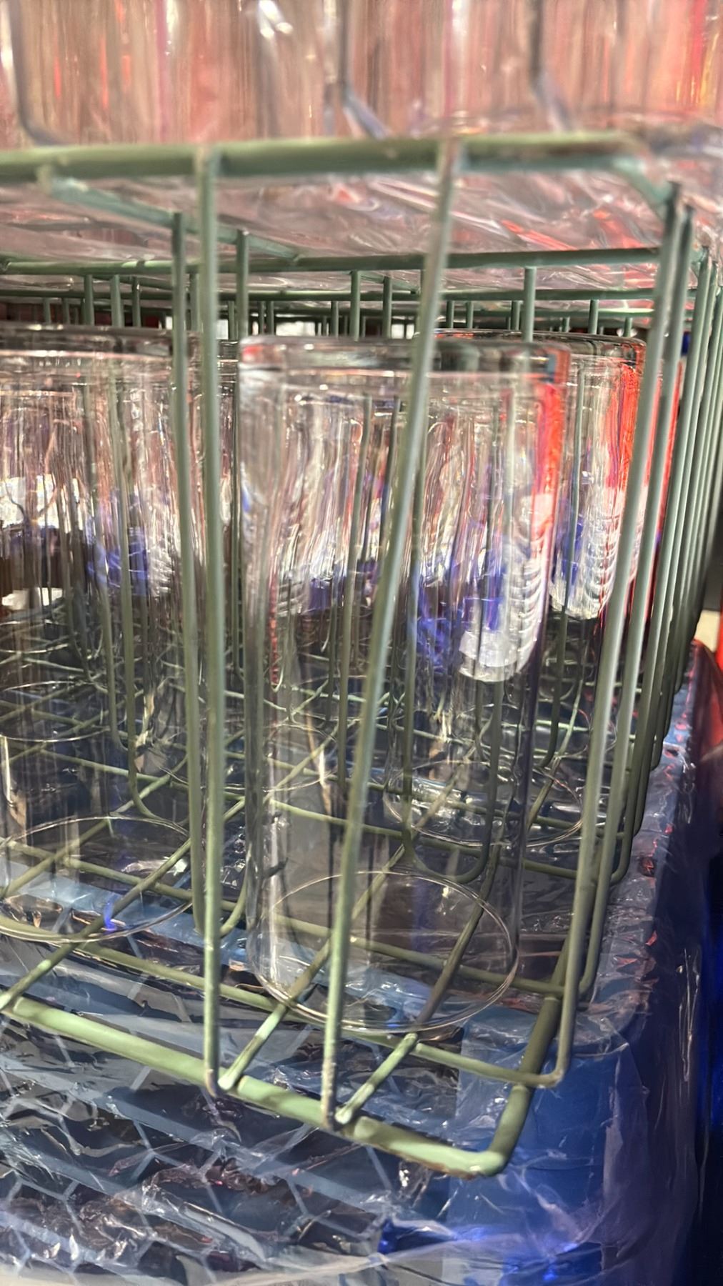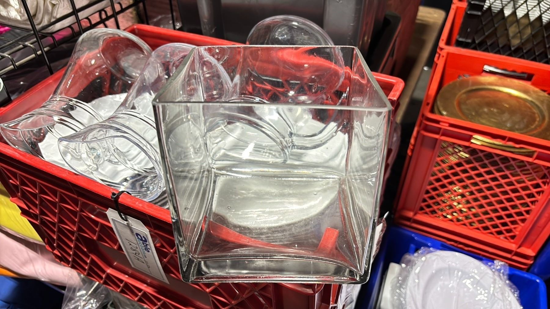 TRAYS OF COMMERCIAL RESTAURANT CLEAR VASES, CLEAR DRINK PITCHERS, CLEAR SQUARE VASES & WHITE 8" SIDE PLATES *BINS INCLUDED*