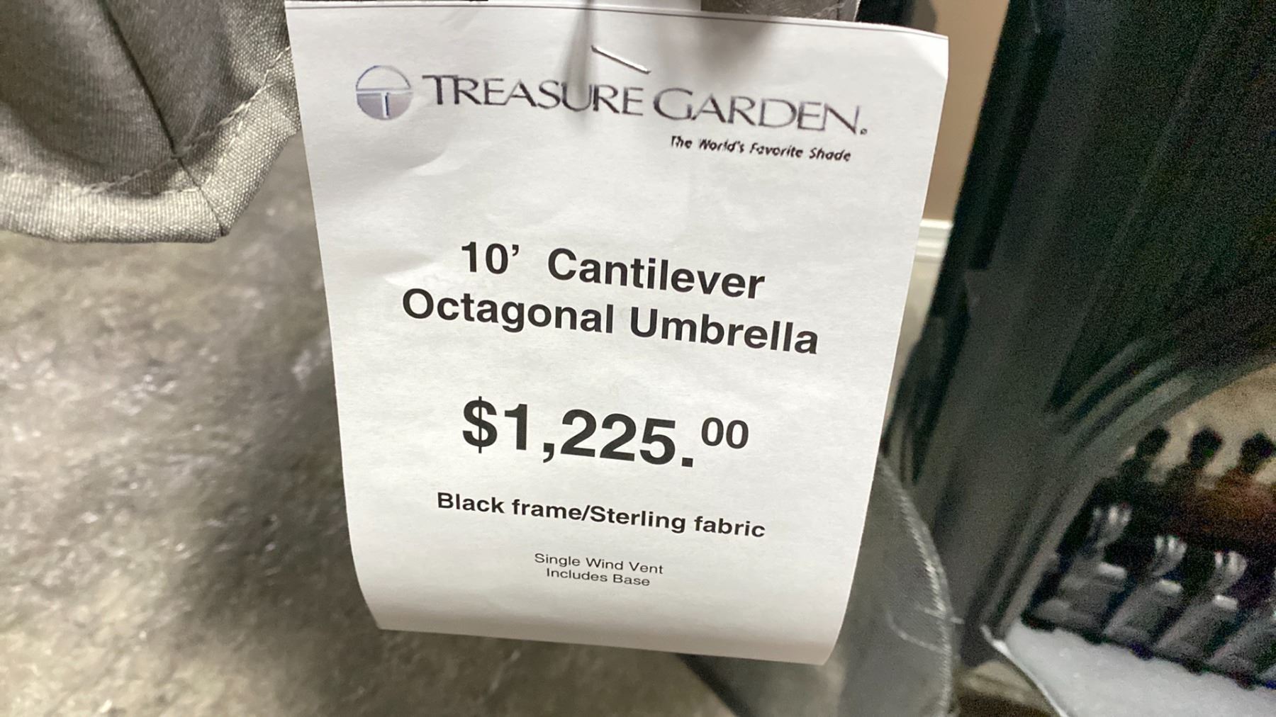 TREASURE GARDEN 10' CANTILEVERED OCTAGONAL UMBRELLA WITH WEIGHTED BASE. BLACK FRAME/STERLING FABRIC