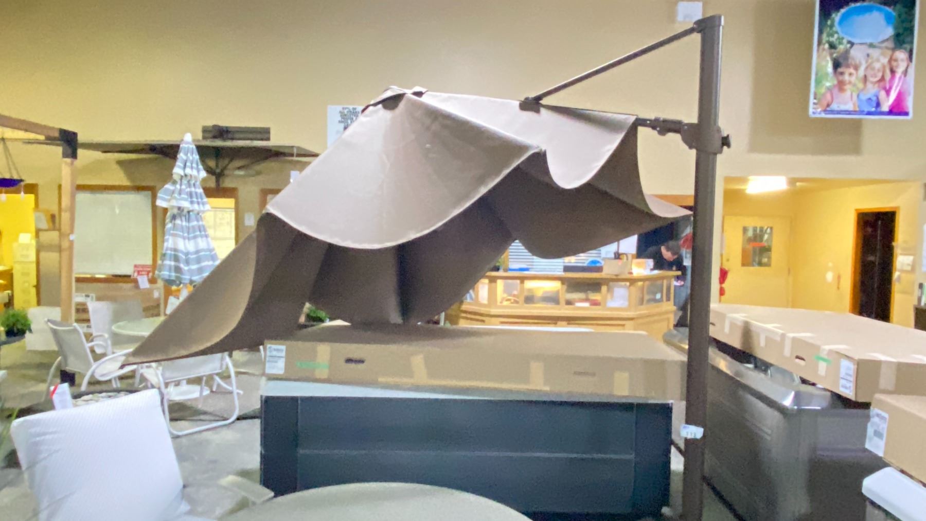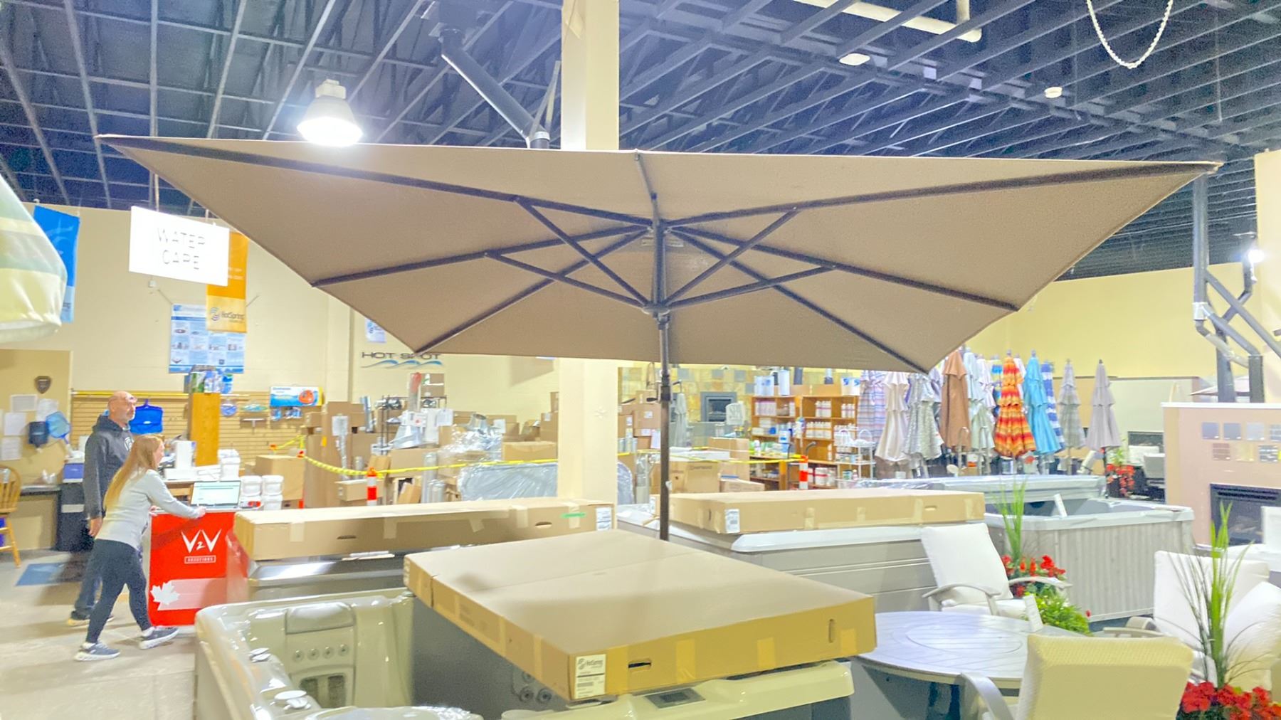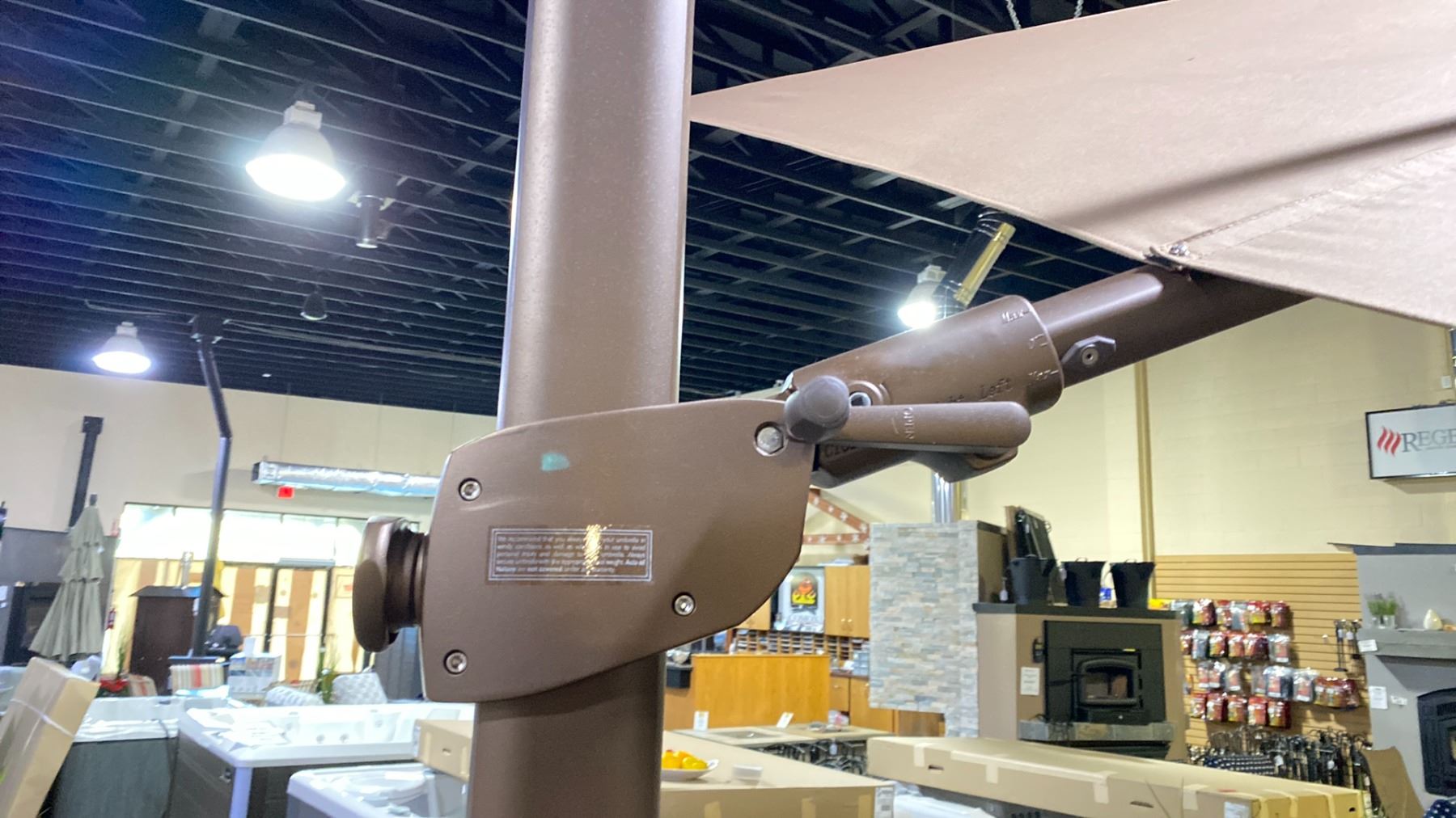TREASURE GARDEN 10' SQUARE CANTILEVERED UMBRELLA WITH BASE. BROWN FRAME MOCHA FABRIC, SINGLE WIND VENT