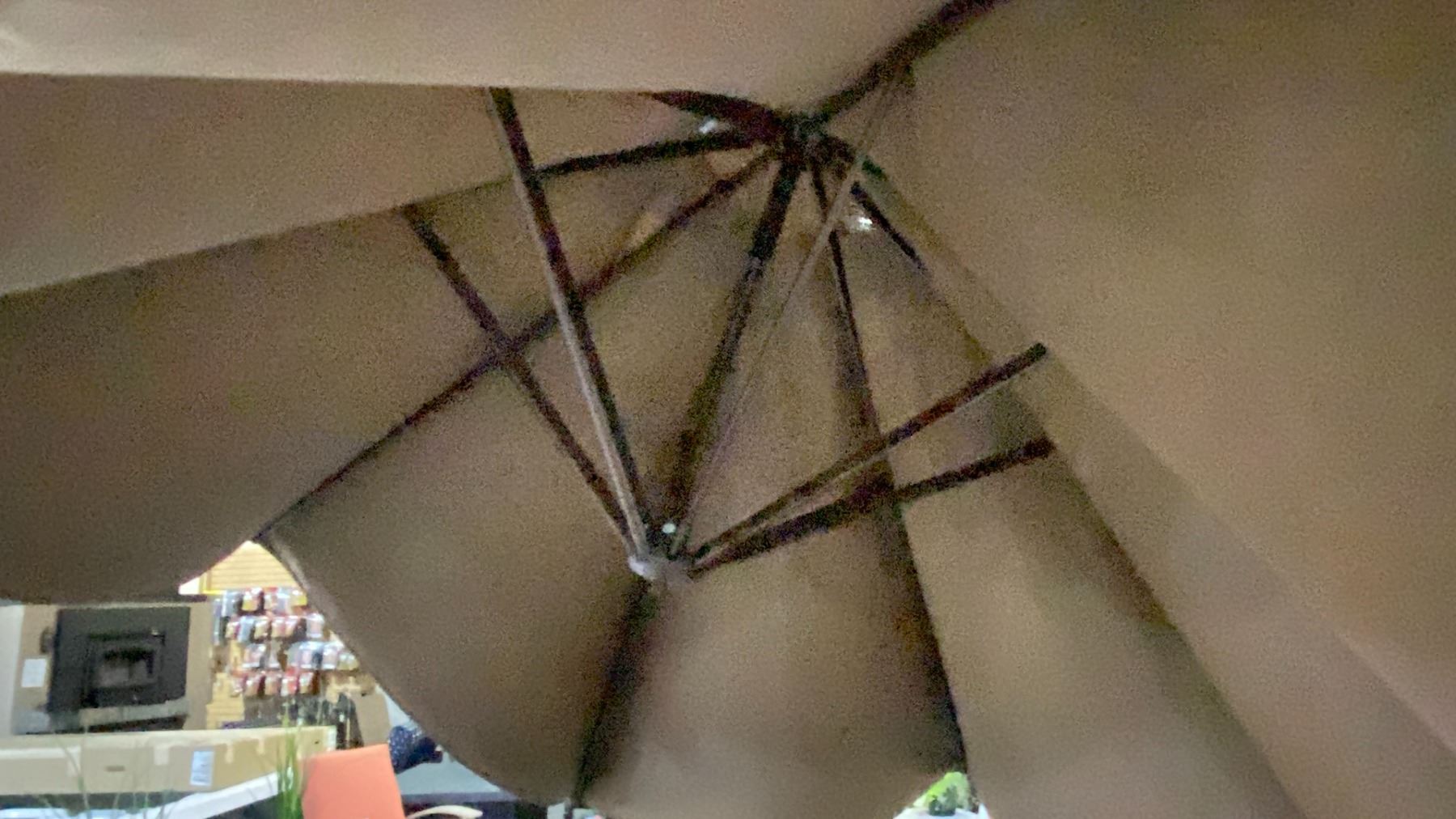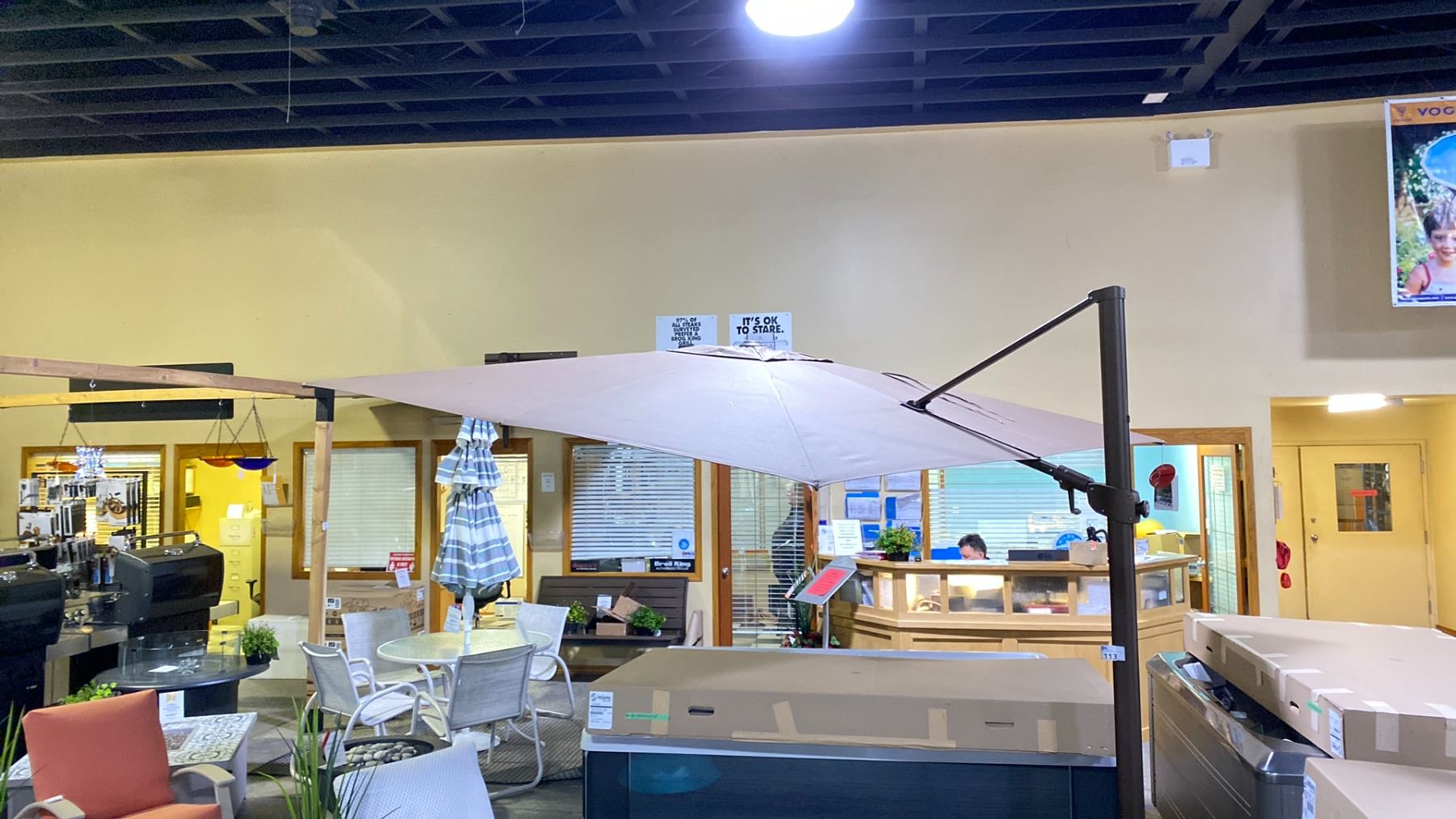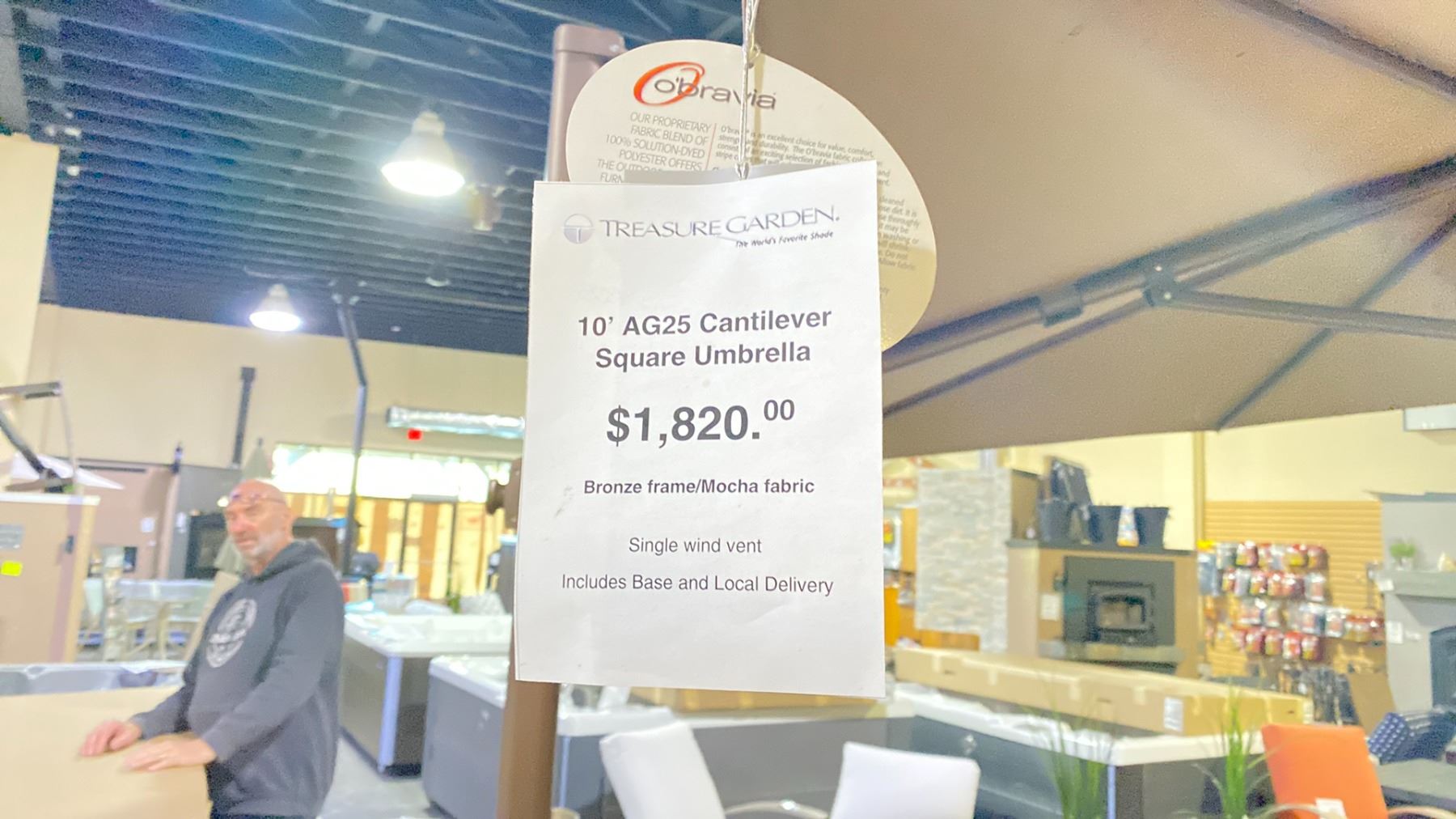 TREASURE GARDEN 10' SQUARE CANTILEVERED UMBRELLA WITH BASE. BROWN FRAME MOCHA FABRIC, SINGLE WIND VENT
