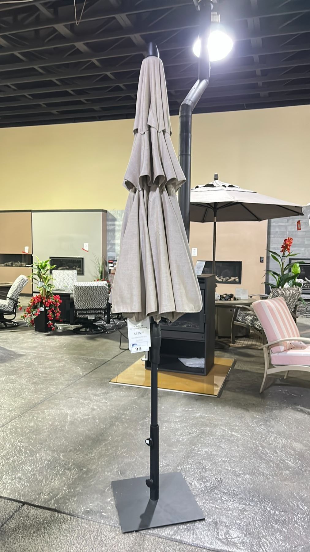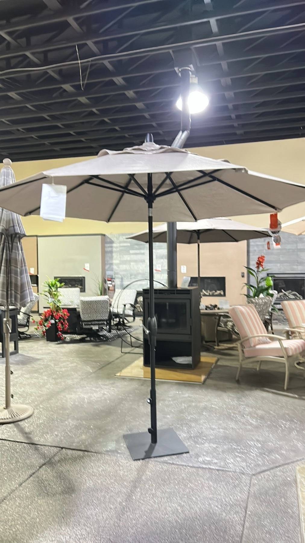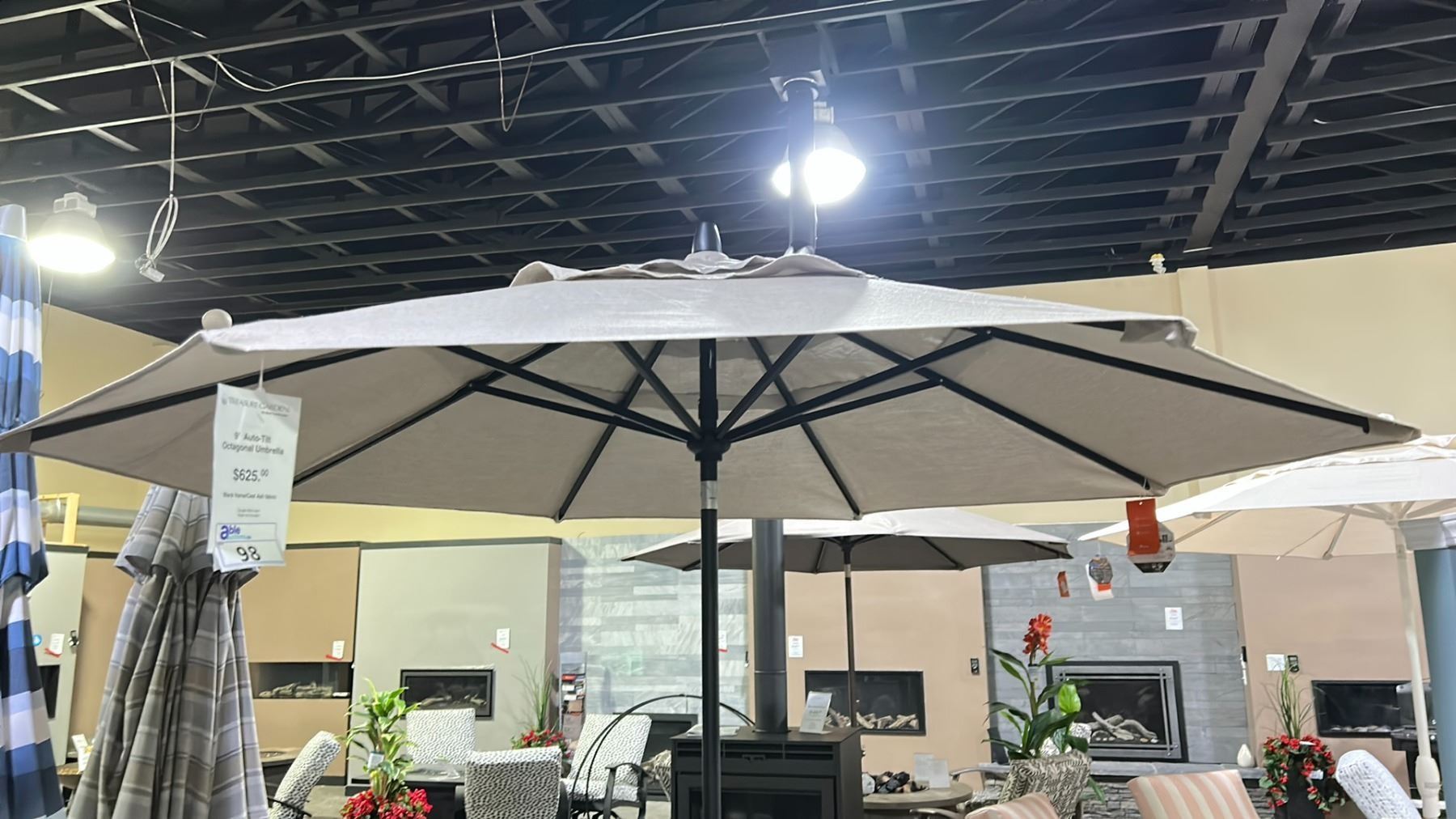 TREASURE GARDEN 9' AUTO-TILT OCTAGONAL UMBRELLA WITH BLACK FRAME/CAST ASH FABRIC AND BASE. DOUBLE WIND VENT