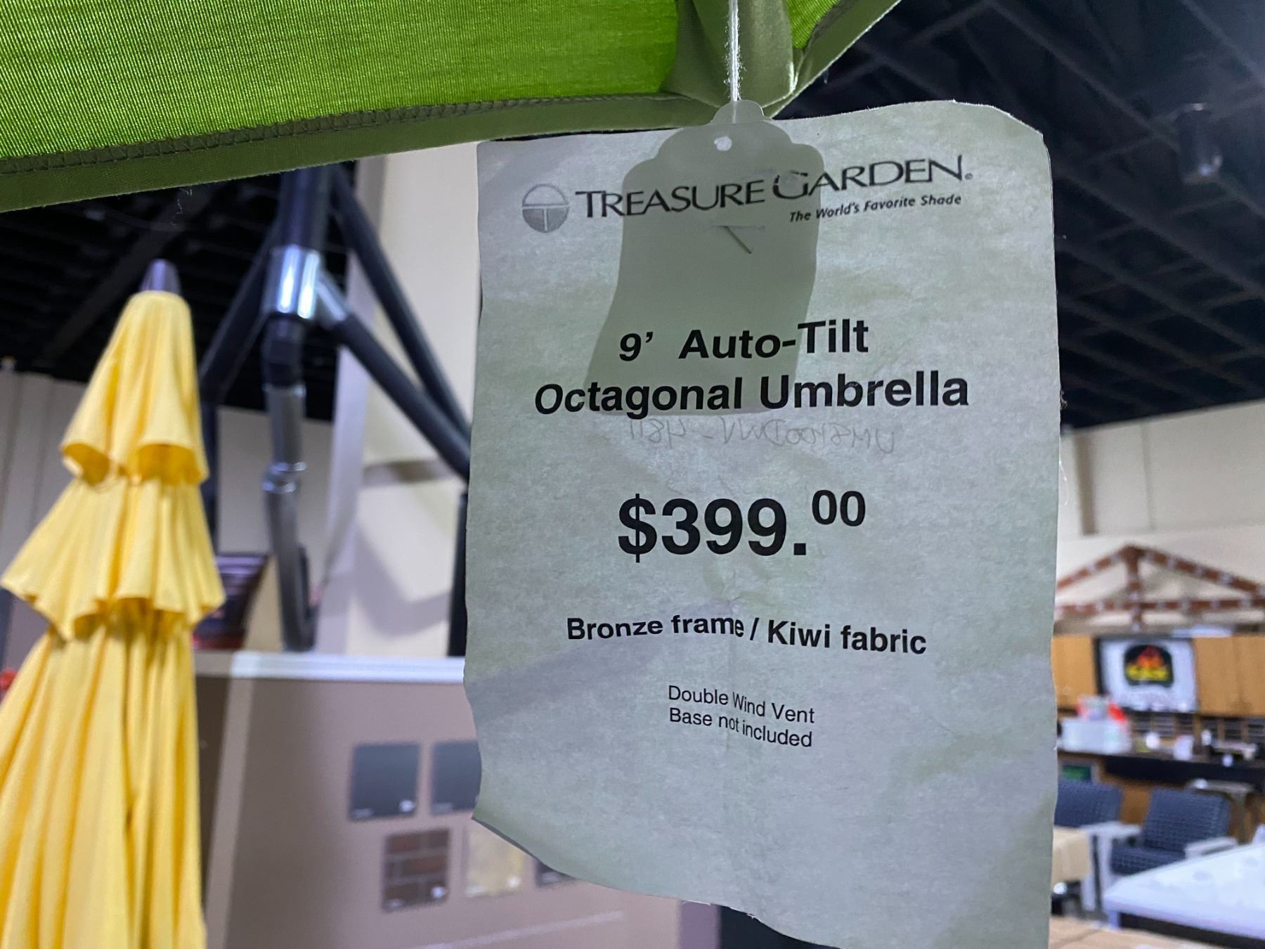 TREASURE GARDEN 9' OCTAGONAL UMBRELLA WITH AUTO TILT AND WEIGHTED BASE. BRONZE FRAME/KIWI FABRIC