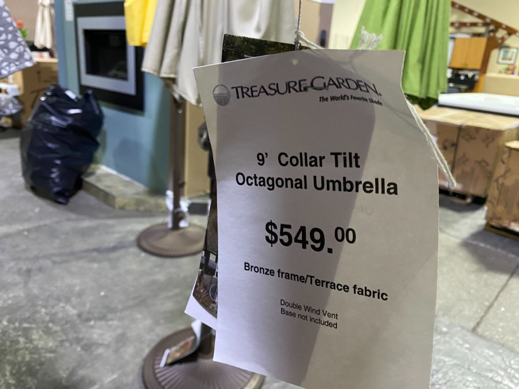 TREASURE GARDEN 9' OCTAGONAL UMBRELLA WITH COLLARED TILT AND WEIGHTED BASE. BRONZE FRAME/PARIS FABRIC