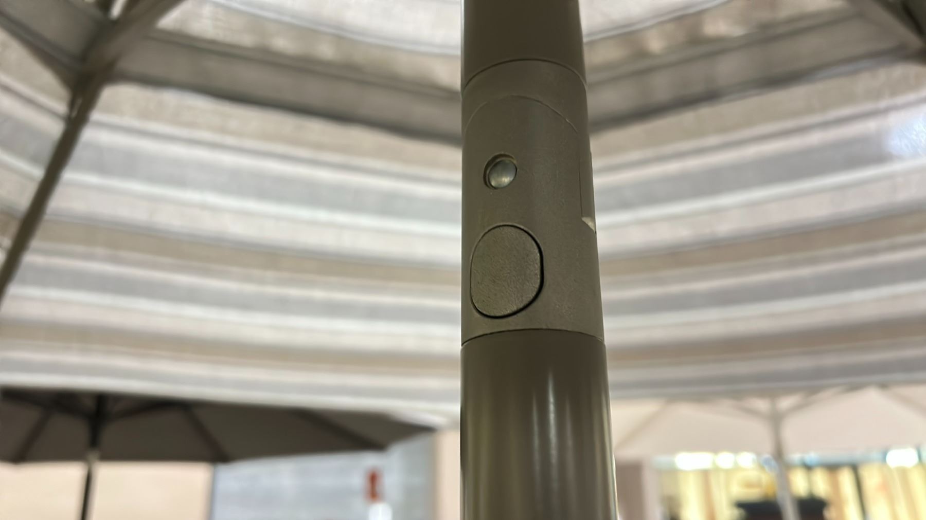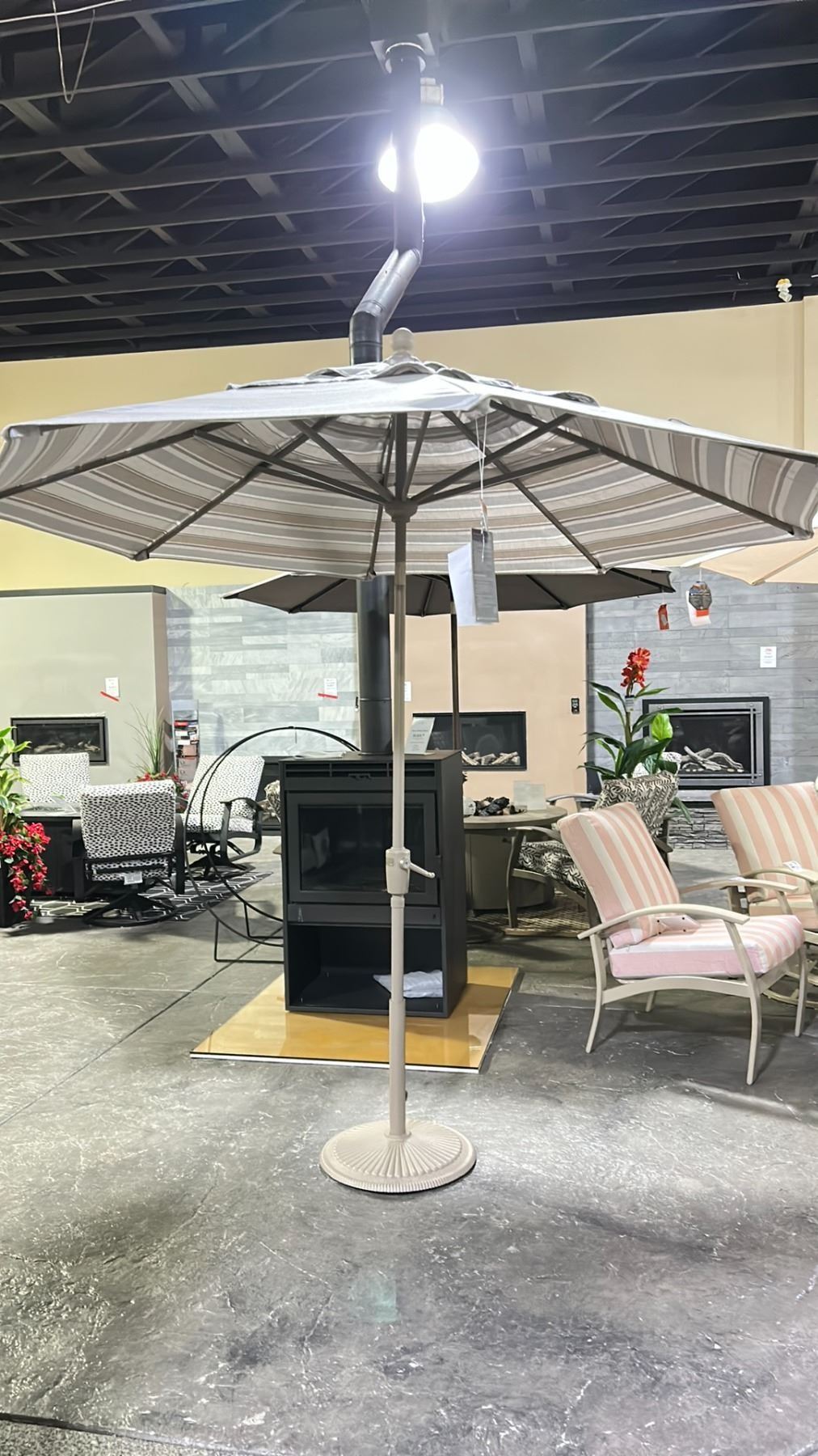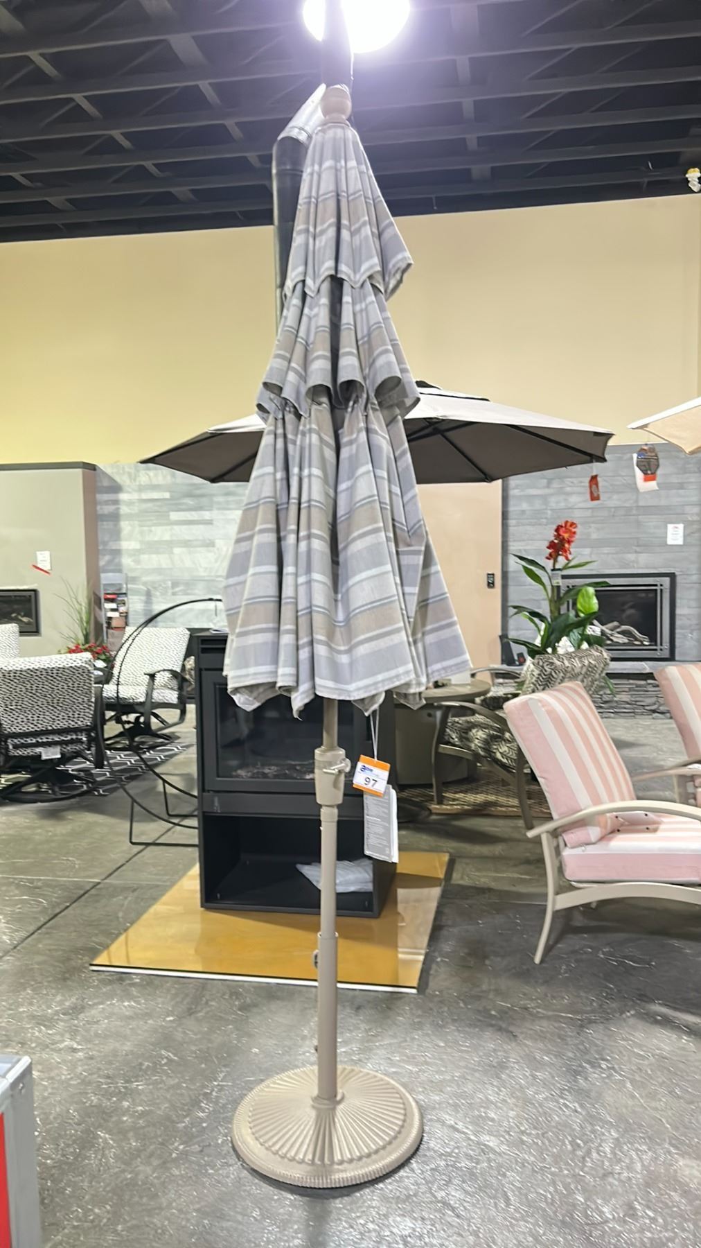 TREASURE GARDEN 9' PUSH BUTTON TILT OCTAGONAL UMBRELLA AND BASE. CHAMPAGNE FRAME/TRUSTED FOG FABRIC. DOUBLE WIND VENT.