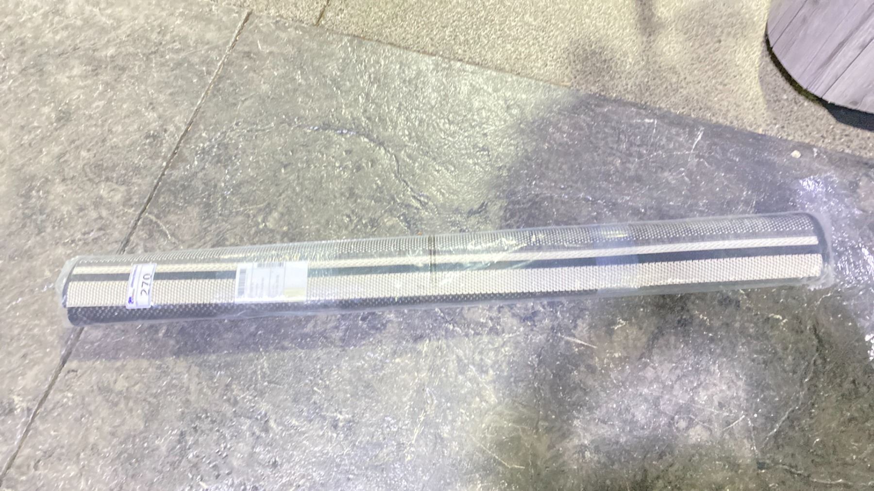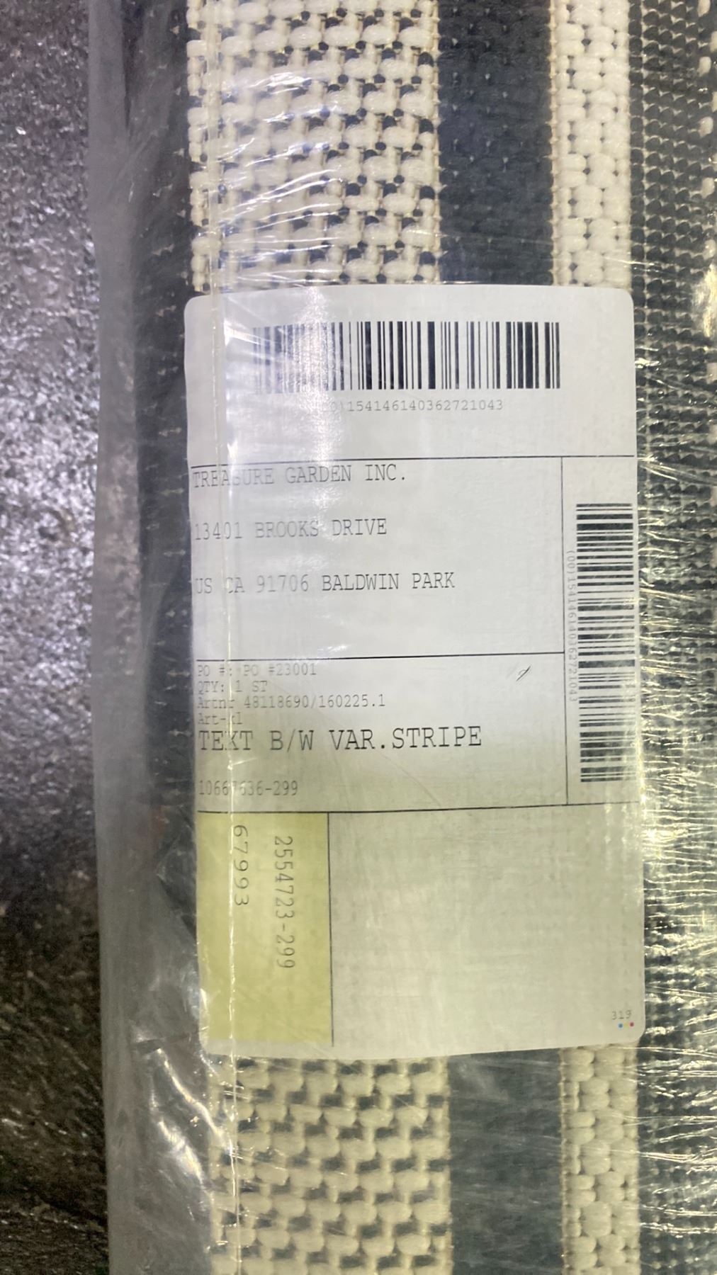TREASURE GARDEN OUTDOOR RUG. FLAT WEAVE. 7'4"X5'3". B/W WITH STRIPE COLOR. UV PROOF, WEATHERPROOF