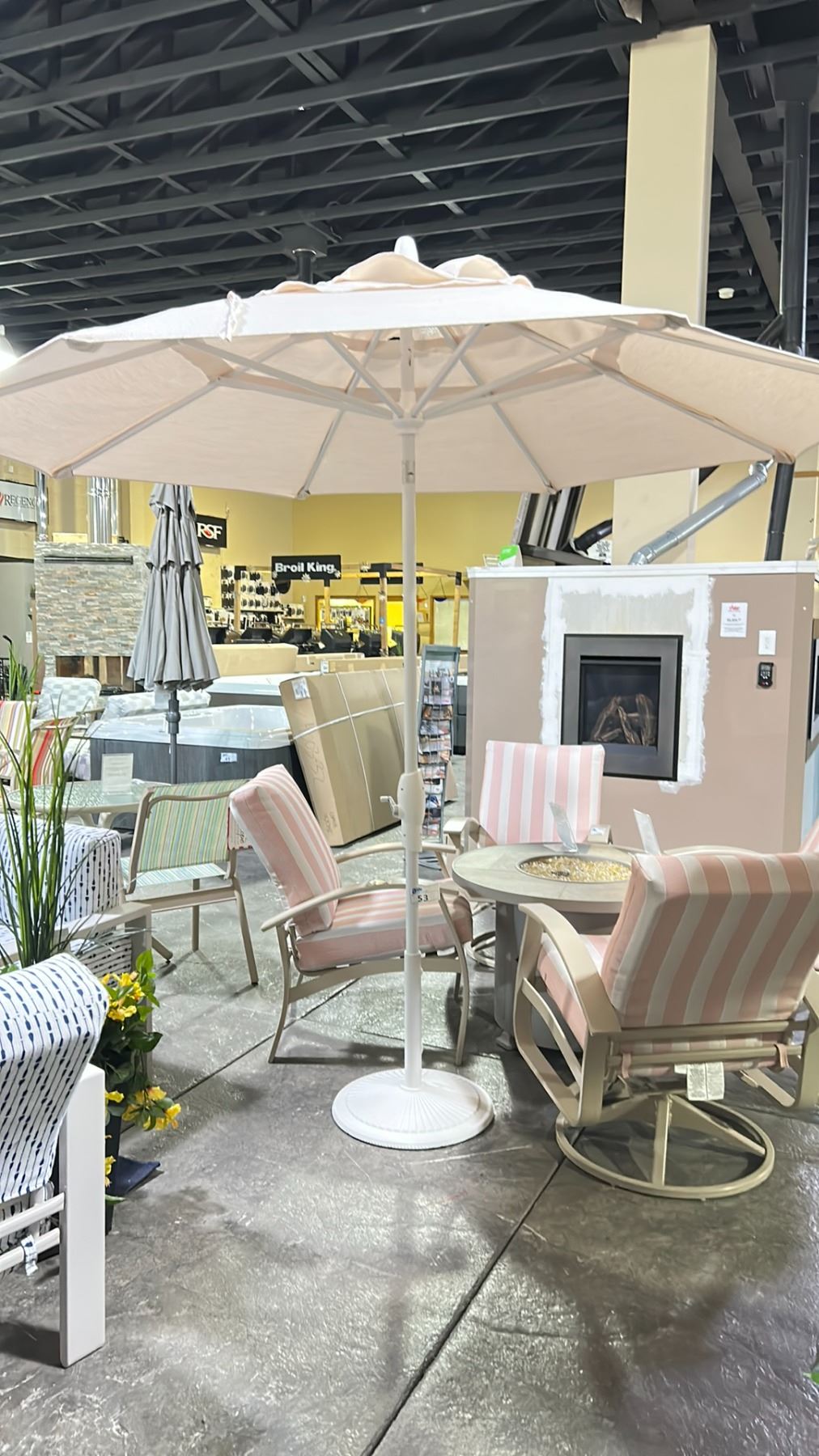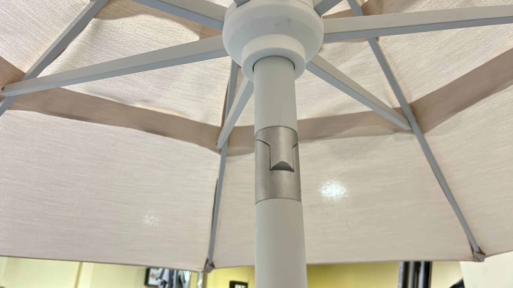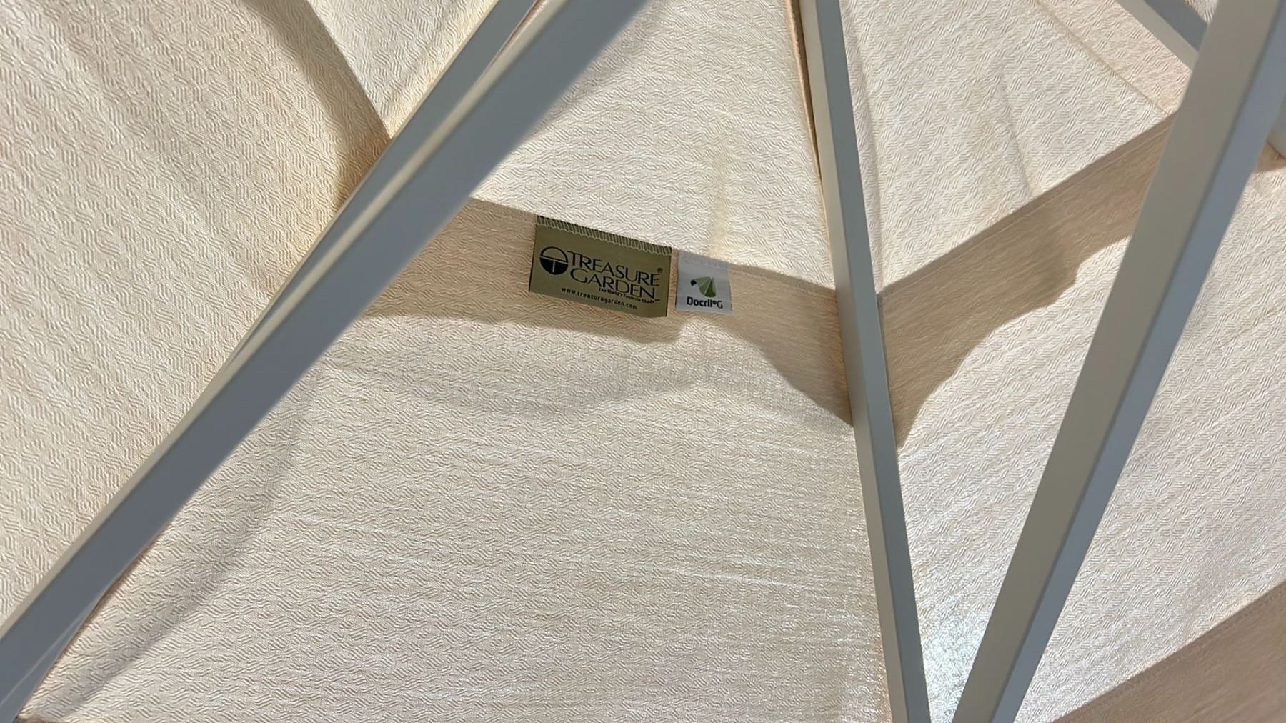 TREASURE GARDEN SUNBRELLA 9' OCTAGONAL AUTO-TILT UMBRELLA WITH METAL BASE. WHITE FRAME WITH TANGO PEARL FABRIC