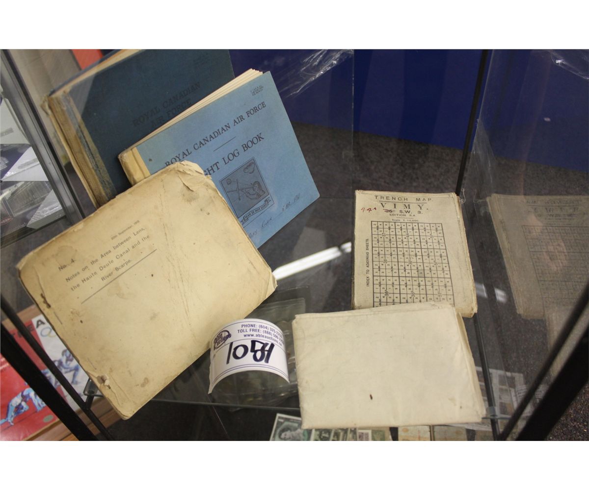 TRENCH MAP OF VIMY, 2 WORLD CANADIAN AIRFORCE LOG BOOKS, AND ASSORTED MAPS