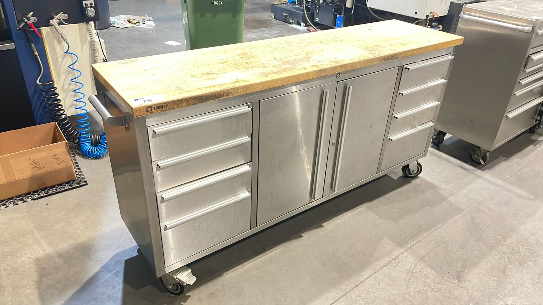 TRINITY MOBILE STAINLESS STEEL TOOLBOX TABLE WITH WOOD BENCH, 8 DRAWER ONE LG CABINET 72"W X 19"D X 37.5 H