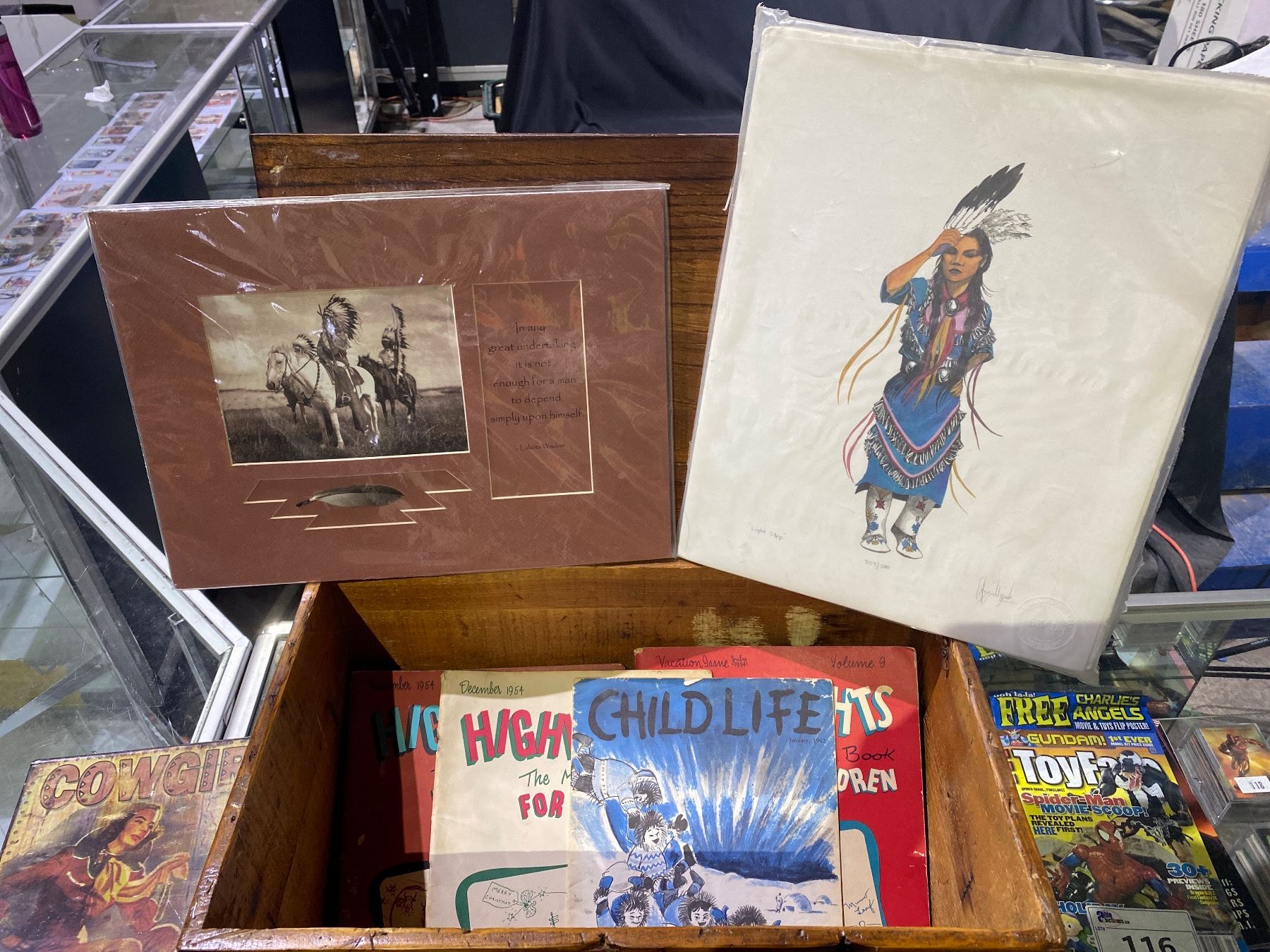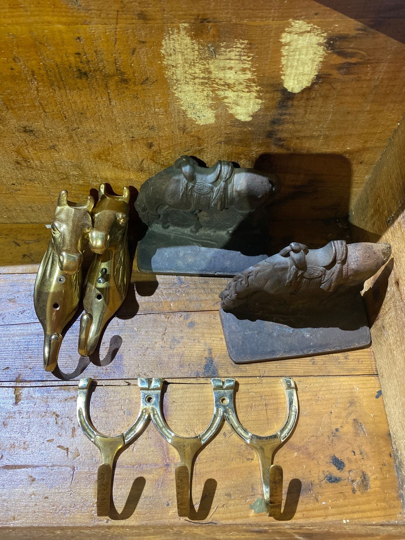 TROJAN POWER CO. WOODEN BOX WITH CONTENTS; BRASS HORSE HANGERS, ABORIGINAL ART AND MORE