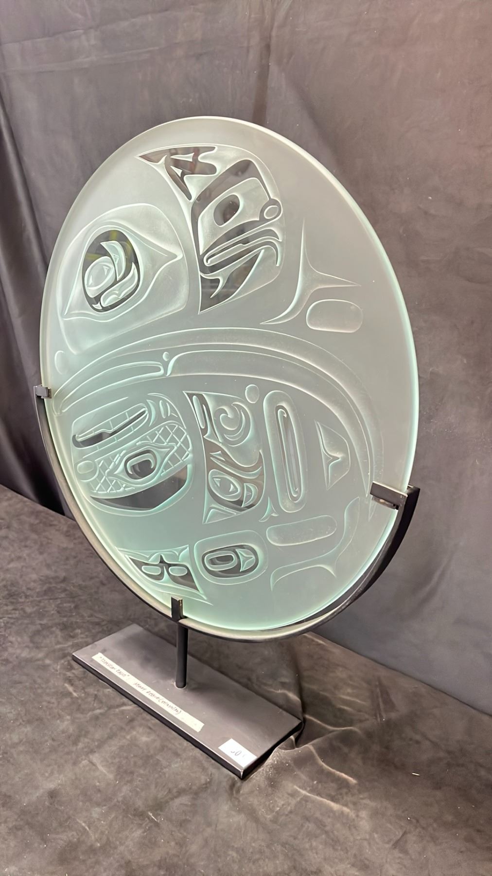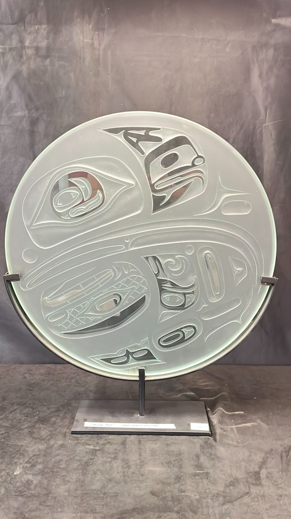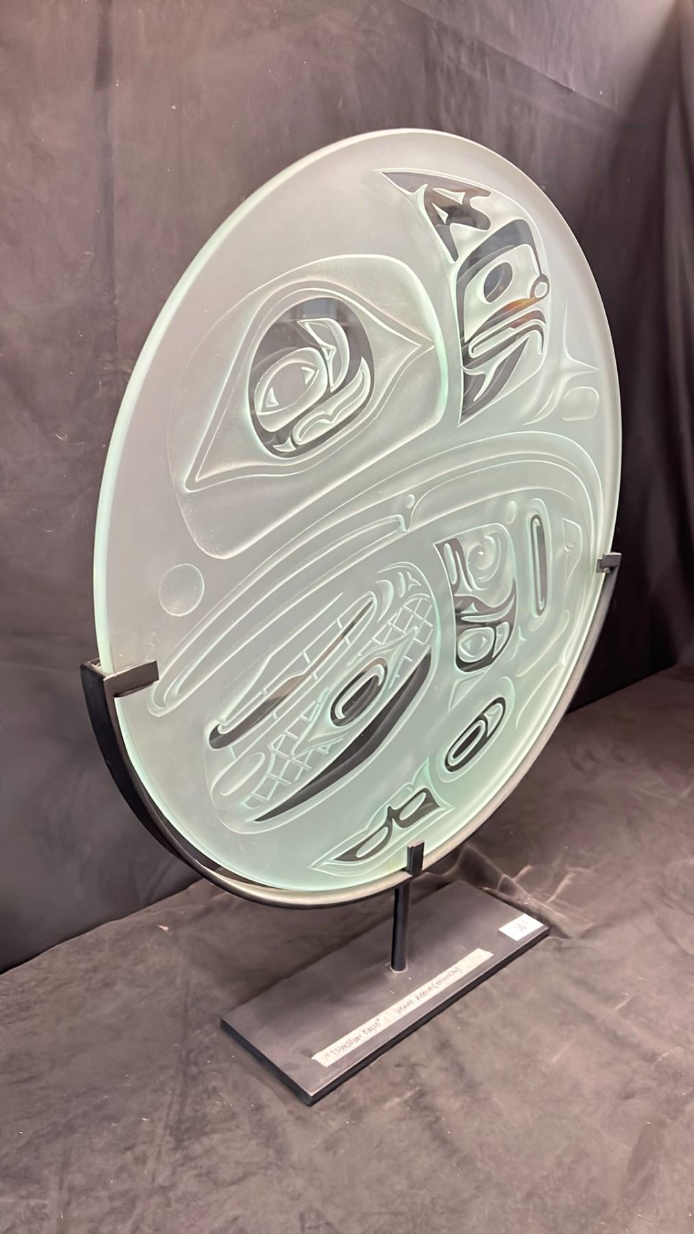 "TSIMSHIAN EAGLE" APPROX 20" PANEL IN GLASS ABOVE PAINTED STEEL BASE BY HENRY REECE (TSIMSHIAN)