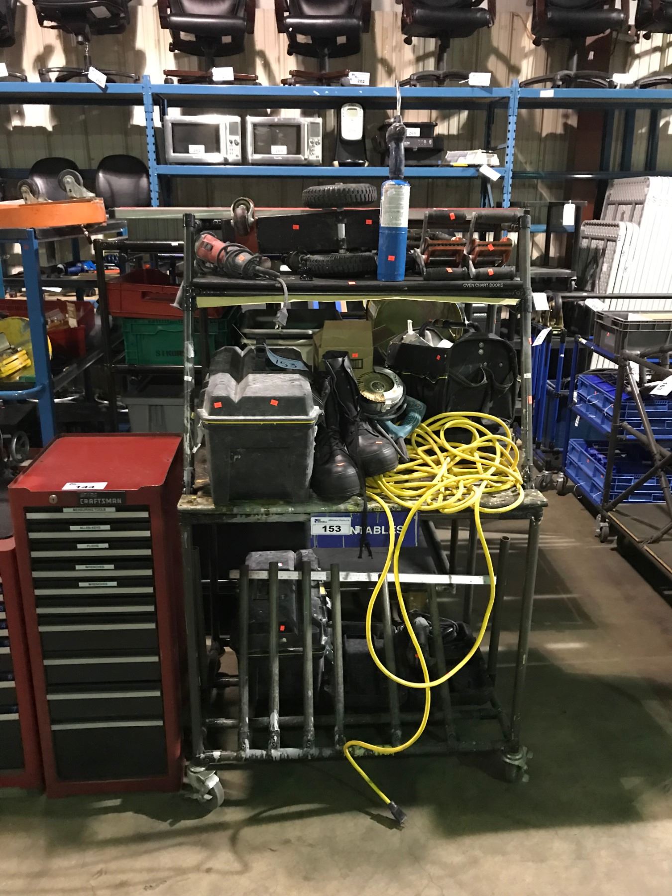 TUBE CONSTRUCTED MOBILE UPRIGHT CART WITH ASSORTED TOOLS & CONTENTS