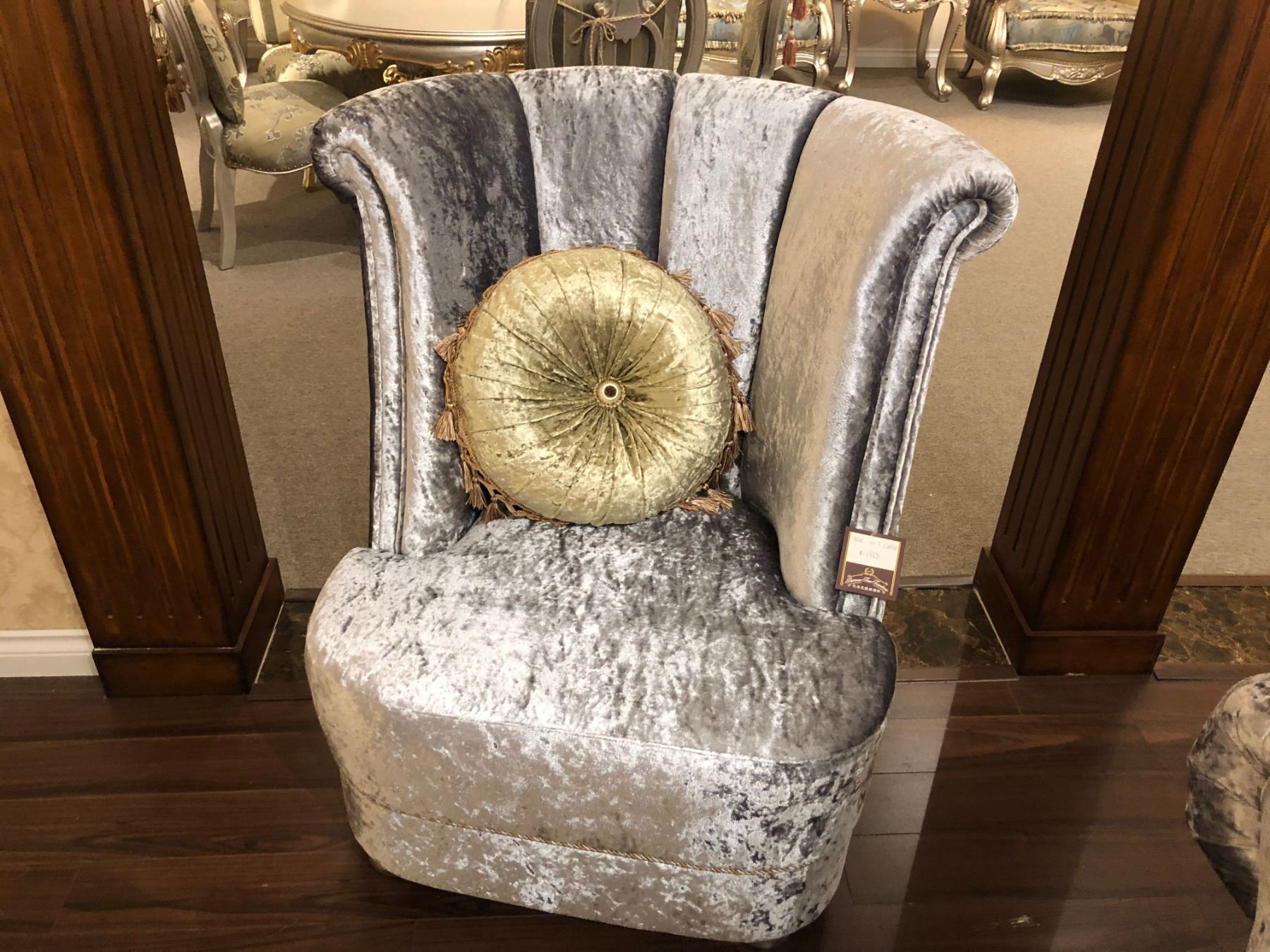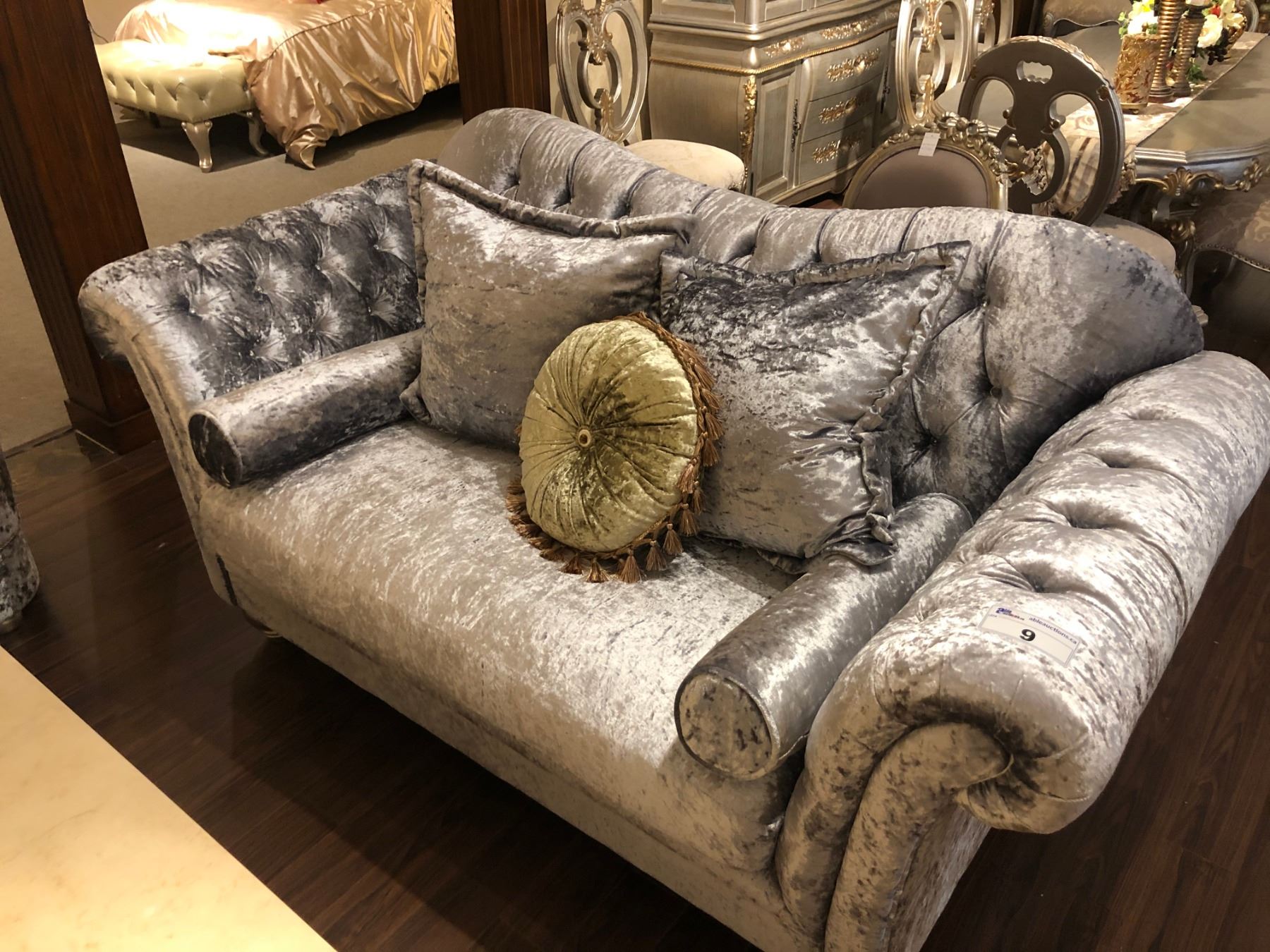 TUFTED BACK OVERSTUFFED FORMAL SILVER SOFA WITH ACCENT CHAIR, EACH COME WITH THROW CUSHIONS. RETAIL $5,850.00