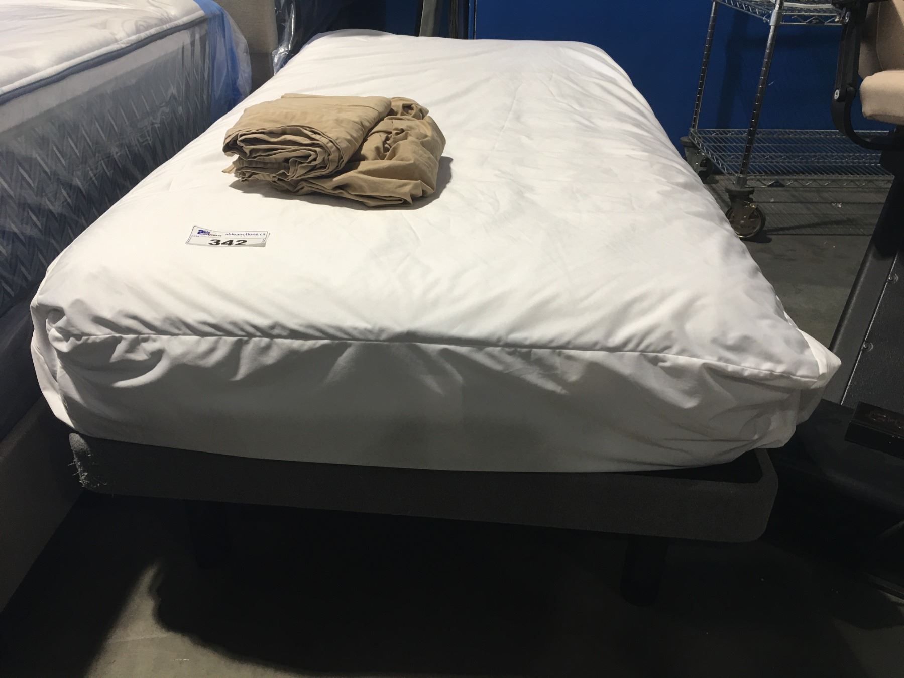 TWIN SIZE MATTRESS ON BED FRAME INCLUDES MATTRESS COVER AND SET OF SHEETS. SOME CAT SCRATCHES NOTED ON BED FRAME