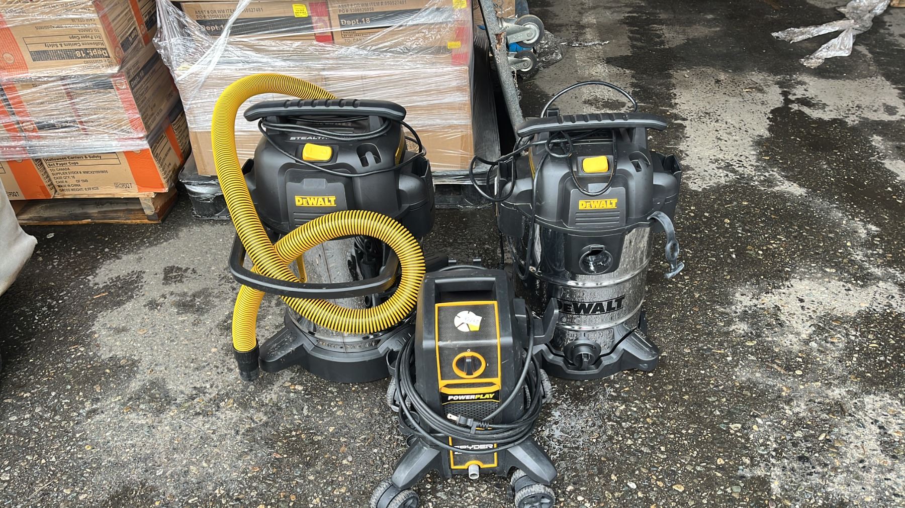 TWO DEWALT STAINLESS STEEL WET/DRY VACUUMS & A POWER PLAY ELECTRIC PRESSURE WASHER