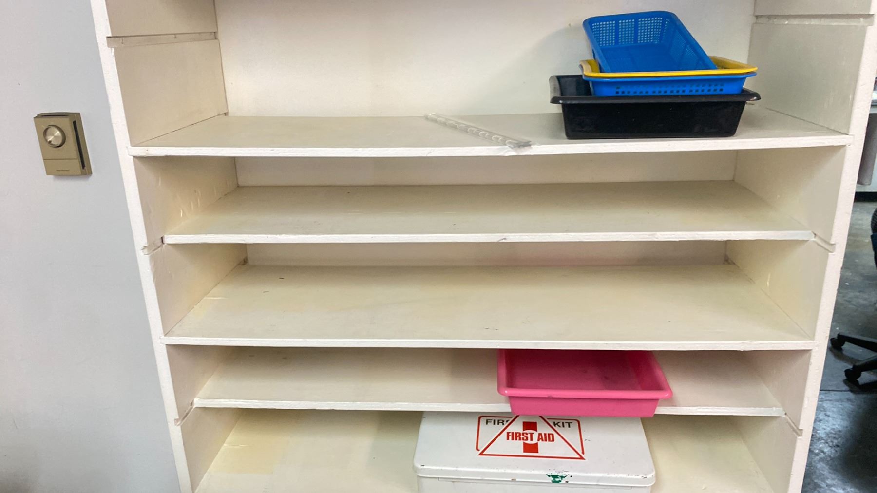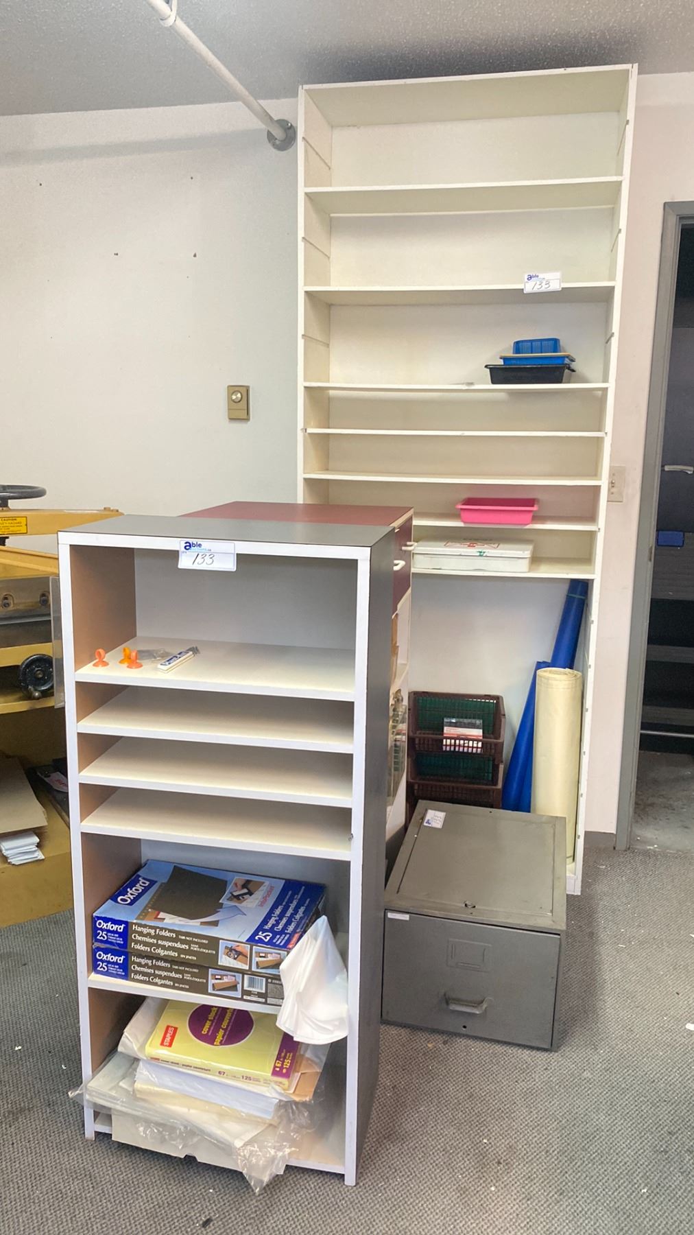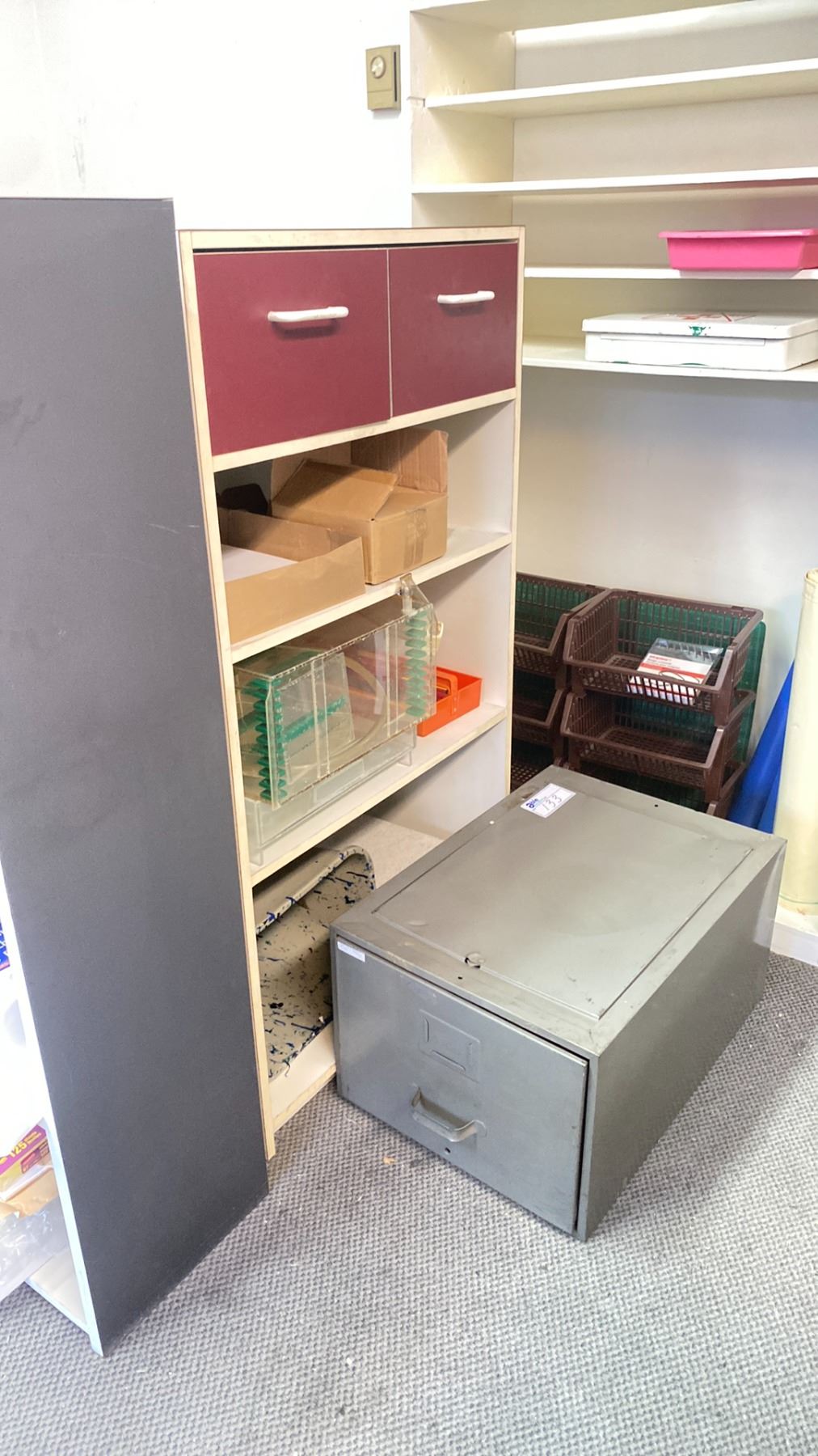 TWO DRAWER THREE SHELF STORAGE CABINET WITH CONTENTS, A SIX TIER BLACK/ WHITE STORAGE CABINET WITH CONTENTS, A GREY METAL FILE CABINET AND A LARGE 8'H WHITE WOODEN BOOKSHELF