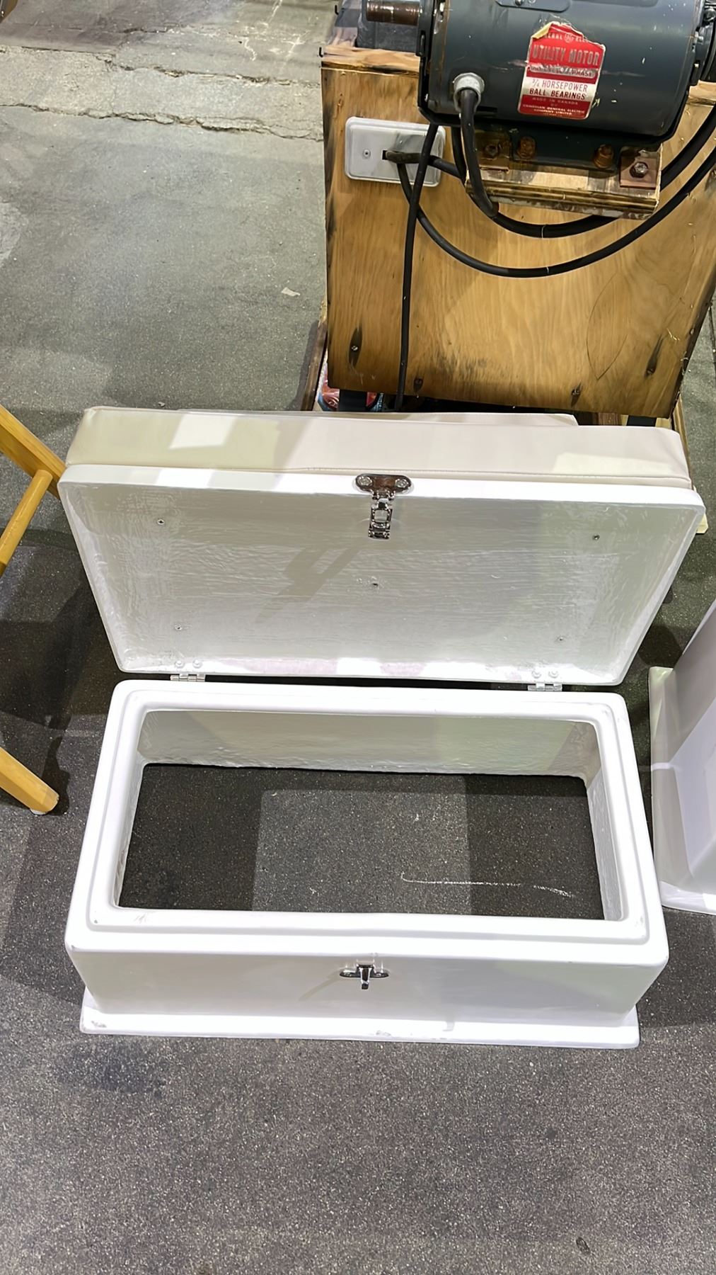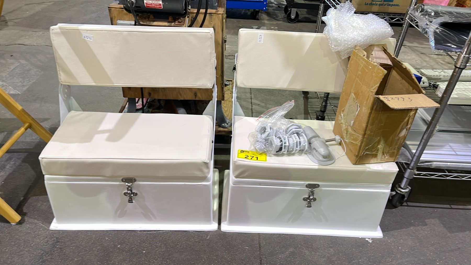 TWO FIBREGLASS BOAT SEATS WITH STORAGE COMPARTMENT UNDERNEATH & BOX OF HARDWARE