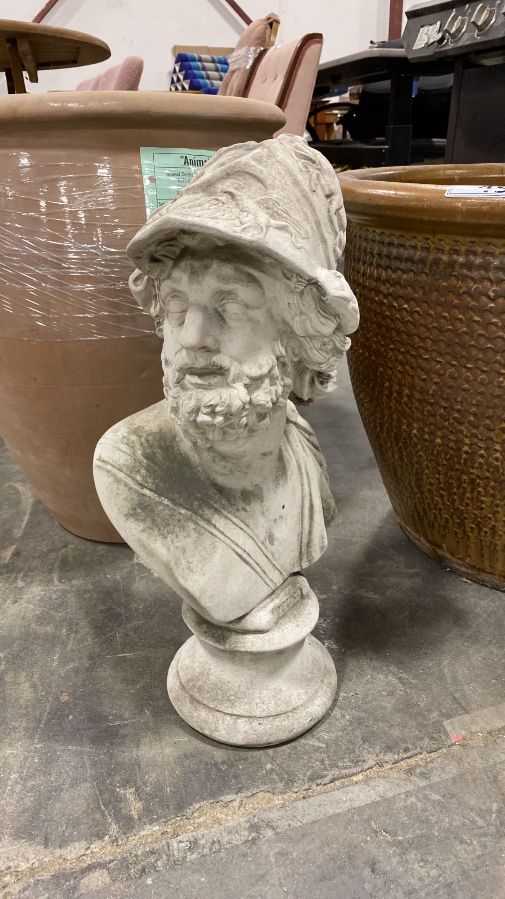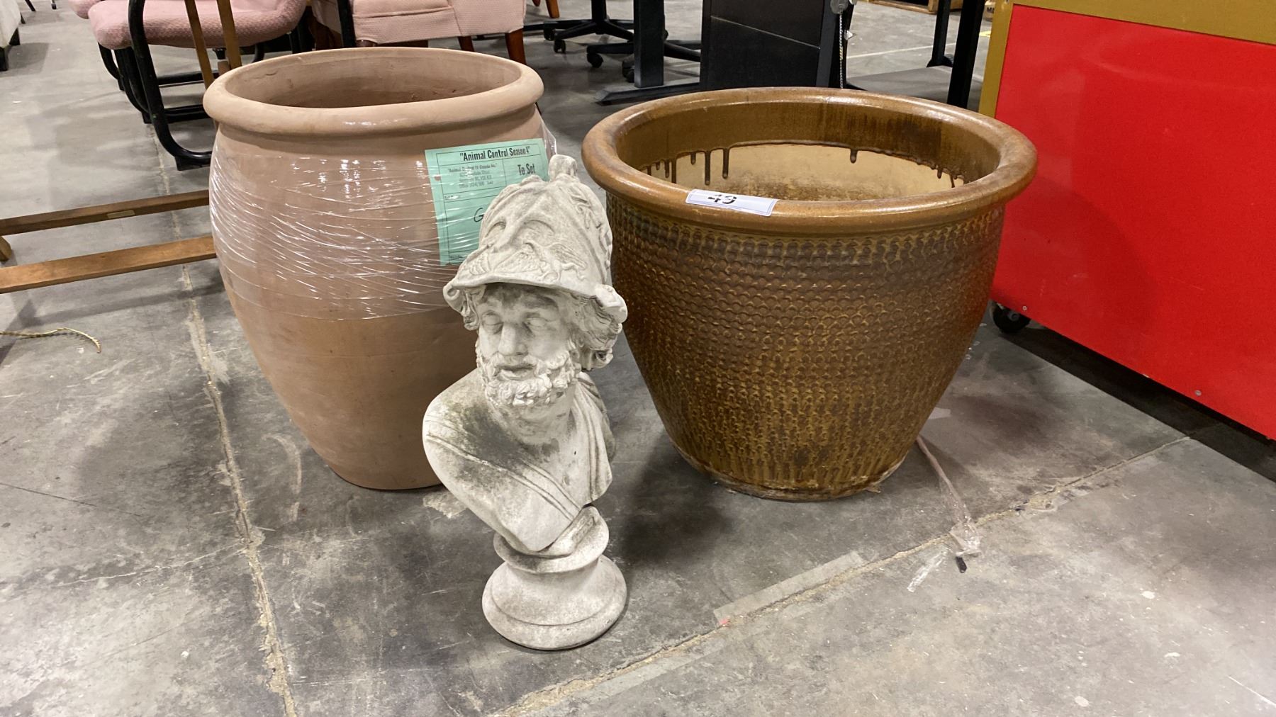 TWO LARGE PLANTER POTS & A DECORATIVE GARDEN PIECE