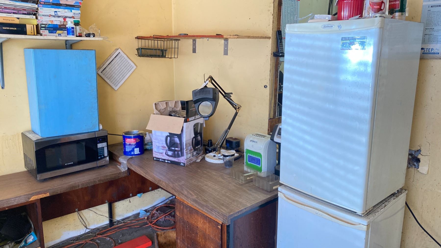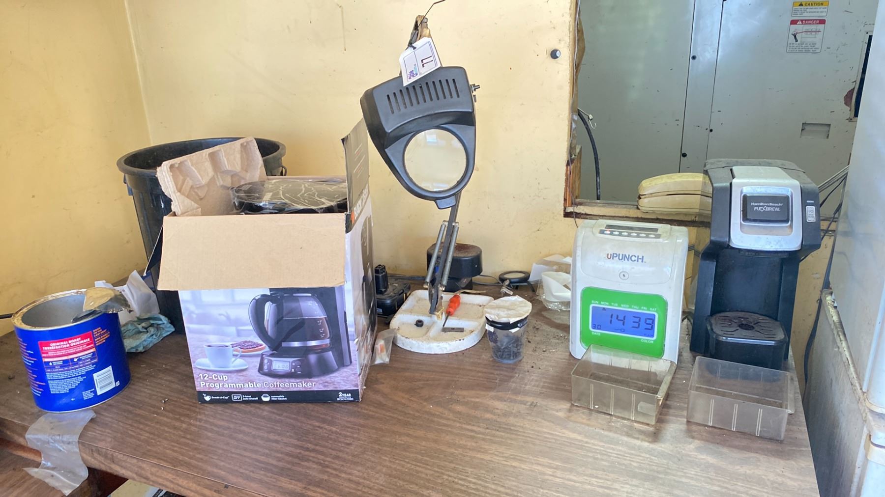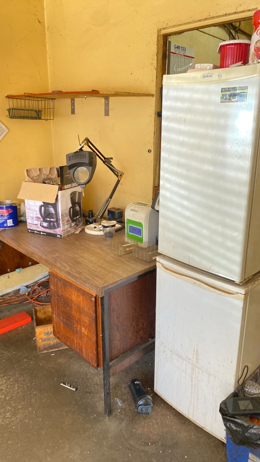 TWO SMALL COMPACT BAR FRIDGES TWO COFFEE MAKERS, TIME CLOCK PUNCH, MAGNIFYING LAMP AND MICROWAVE