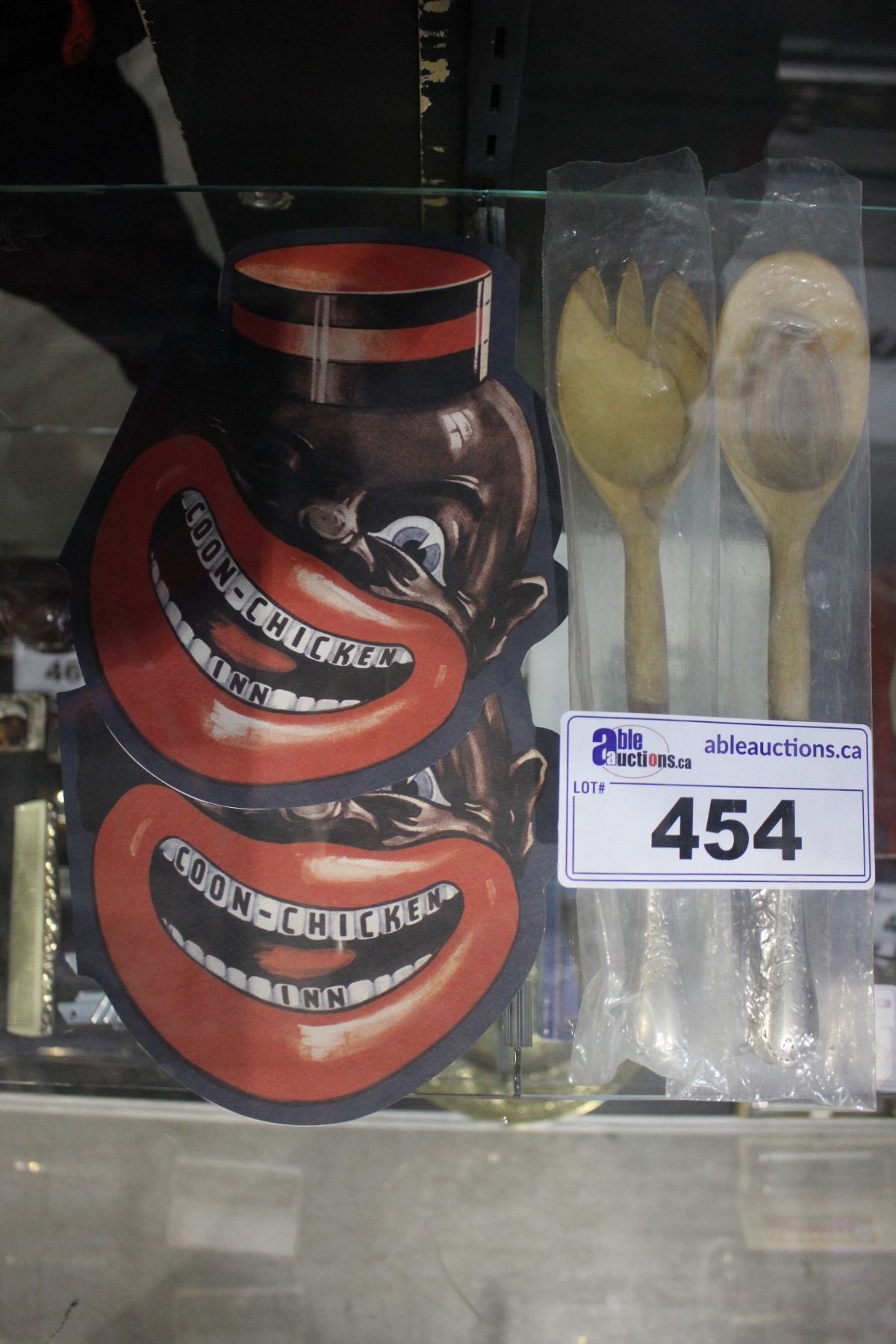 TWO VINTAGE COON CHICKEN INN MENUS AND VINTAGE SALAD SPOONS